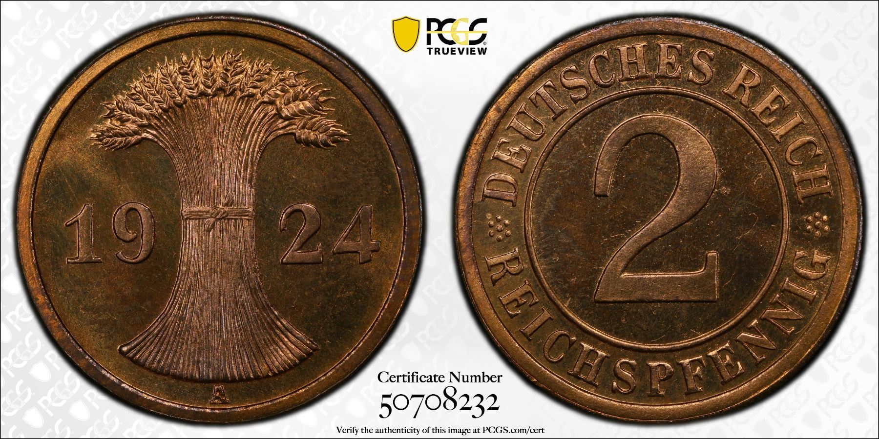 GERMANY: Weimar Republic, AE 2 reichspfennig, 1924-A, KM-38, J-314, a superb proof quality example! PCGS graded Proof 65 RD, ex Joe Sedillot Collection.