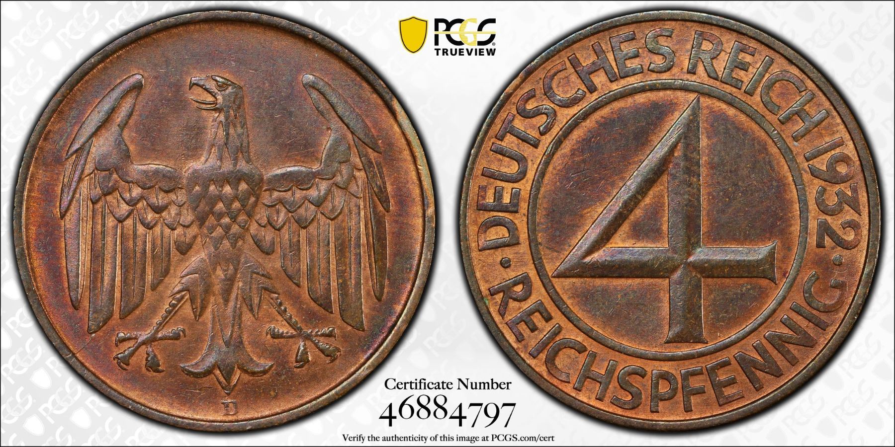 GERMANY: Weimar Republic, AE 4 reichspfennig, 1932-D, KM-75, J-315, significant red remaining, a lovely mint state example! PCGS graded MS63 BN.