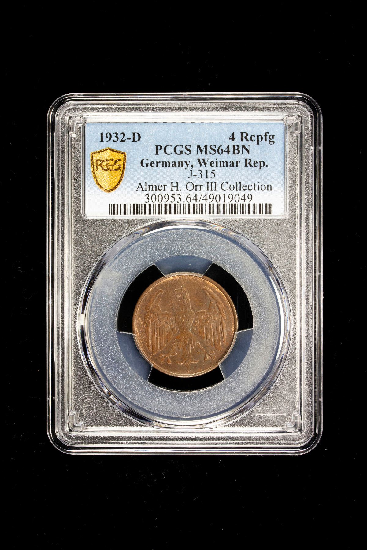 GERMANY: Weimar Republic, AE 4 reichspfennig, 1932-D, KM-75, PCGS graded MS64 BN, ex Almer H. Orr III Collection.