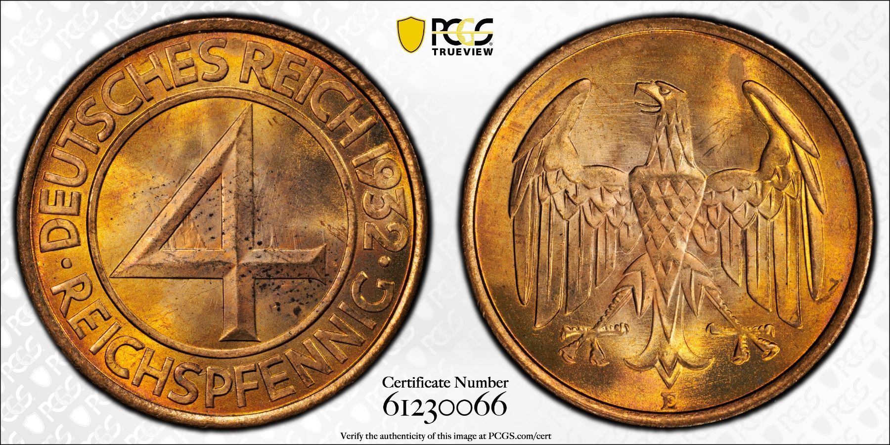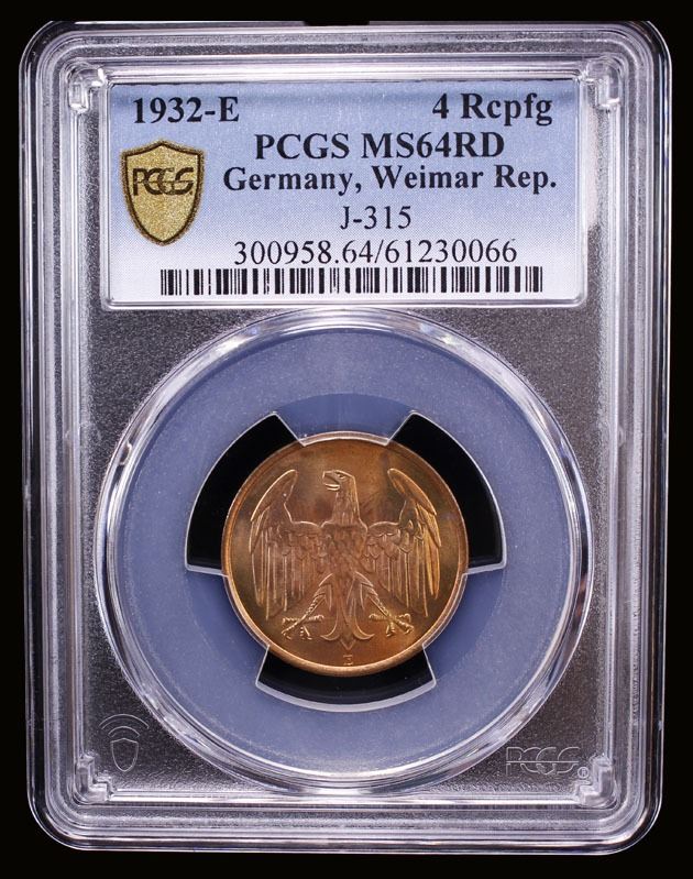 GERMANY: Weimar Republic, AE 4 reichspfennig, 1932-E, PCGS MS64 RD