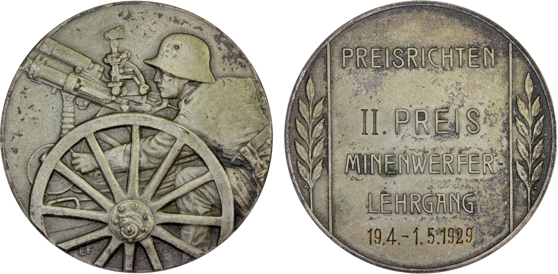 GERMANY: Weimar Republic, AE medal (50.49g), 1929, cf. Hüsken-03.06.36/2var, 50mm silvered bronze shooting award medal by E. Fischer for Lauer, 2nd prize for the mortar course, soldier kneeling left operating wheeled machine gun // "PREISRICHTEN / II. PREIS / MINENWERFER- / LEHRGANG / (engraved) 19.4.-1.5.1929" with laurel sprig at far left and far right, a bit of mottled toning, plain edge, XF.
