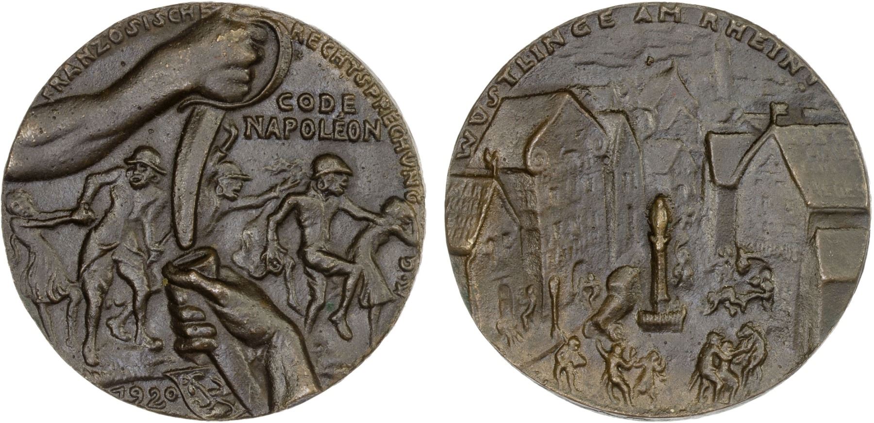 GERMANY: Weimar Republic, AE medal (76.57g), 1920, Kienast-274, 60mm cast bronze medal on the Napoleonic Code and French Jurisprudence by Karl Goetz, sword being forced into scabbard below (an allusion to alleged rapes) with French African colonial troops dragging away German women behind and CODE / NAPOLEON in right field and FRANZOSISCHE - RECHTSPRECHUNG around and "1920" in exergue // cityscape with MAROKANER BORDELL (brothel), BORDELL / RATHAUS, and WEINHAUS / LUST-HAUS FUR NEGER inscribed on rooftops, soldiers attacking women below, and WUSTLINGE AM RHEIN around, nice chocolate-brown color, file marks on edge as made, AU. One of the medals Goetz produced during this period against the French Colonial (African) occupation.