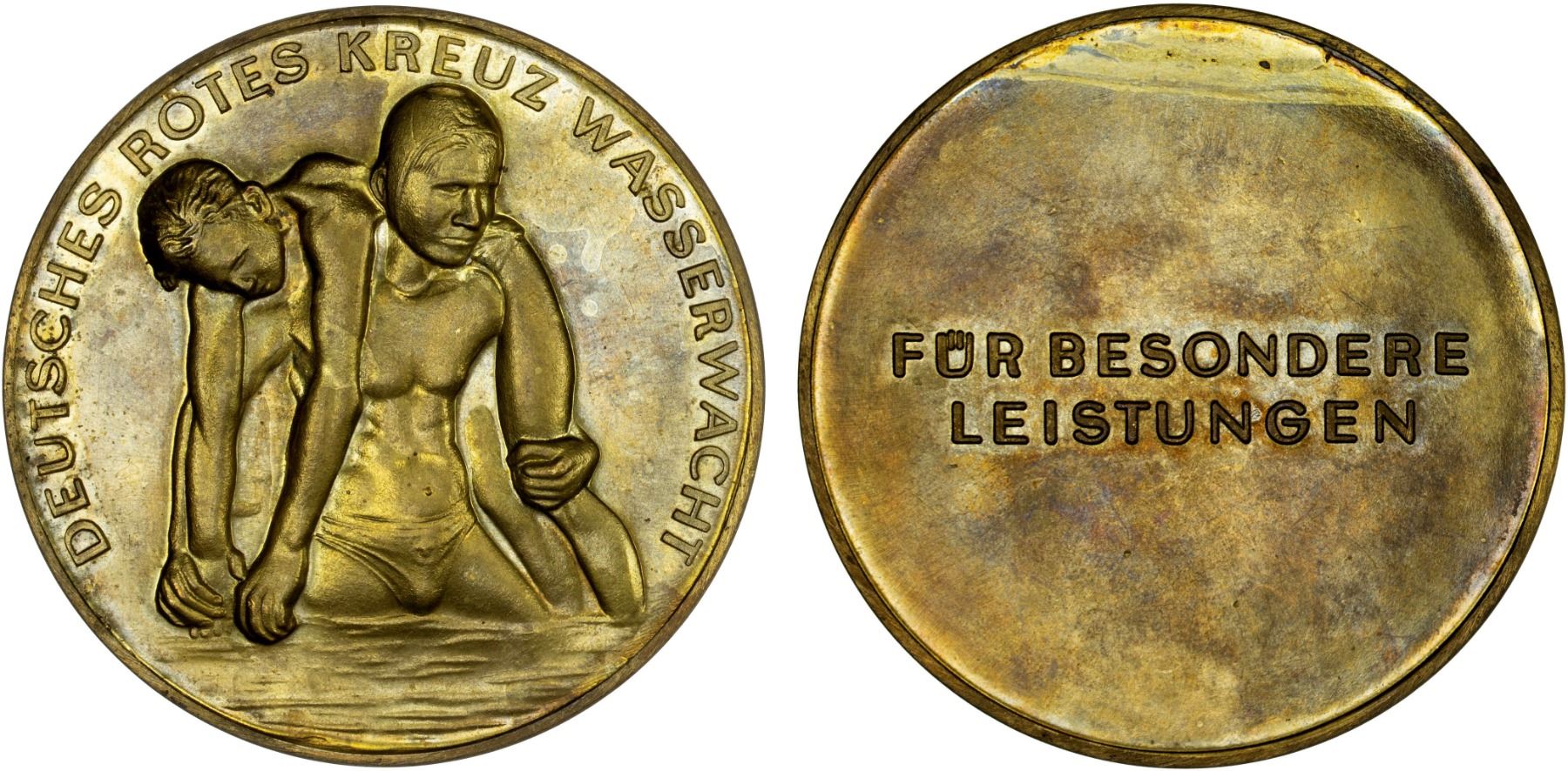 GERMANY: Weimar Republic, AE medal (77.86g), ND (ca. 1930), 60mm unsigned gilt bronze Red Cross lifesaving award medal, rescuer in water carrying man on his shoulders with DEUTSCHES ROTES KREUZ WASSERWACHT around // FÜR BESONDERE / LEISTUNGEN, somewhat mottled toning, plain edge, Unc.