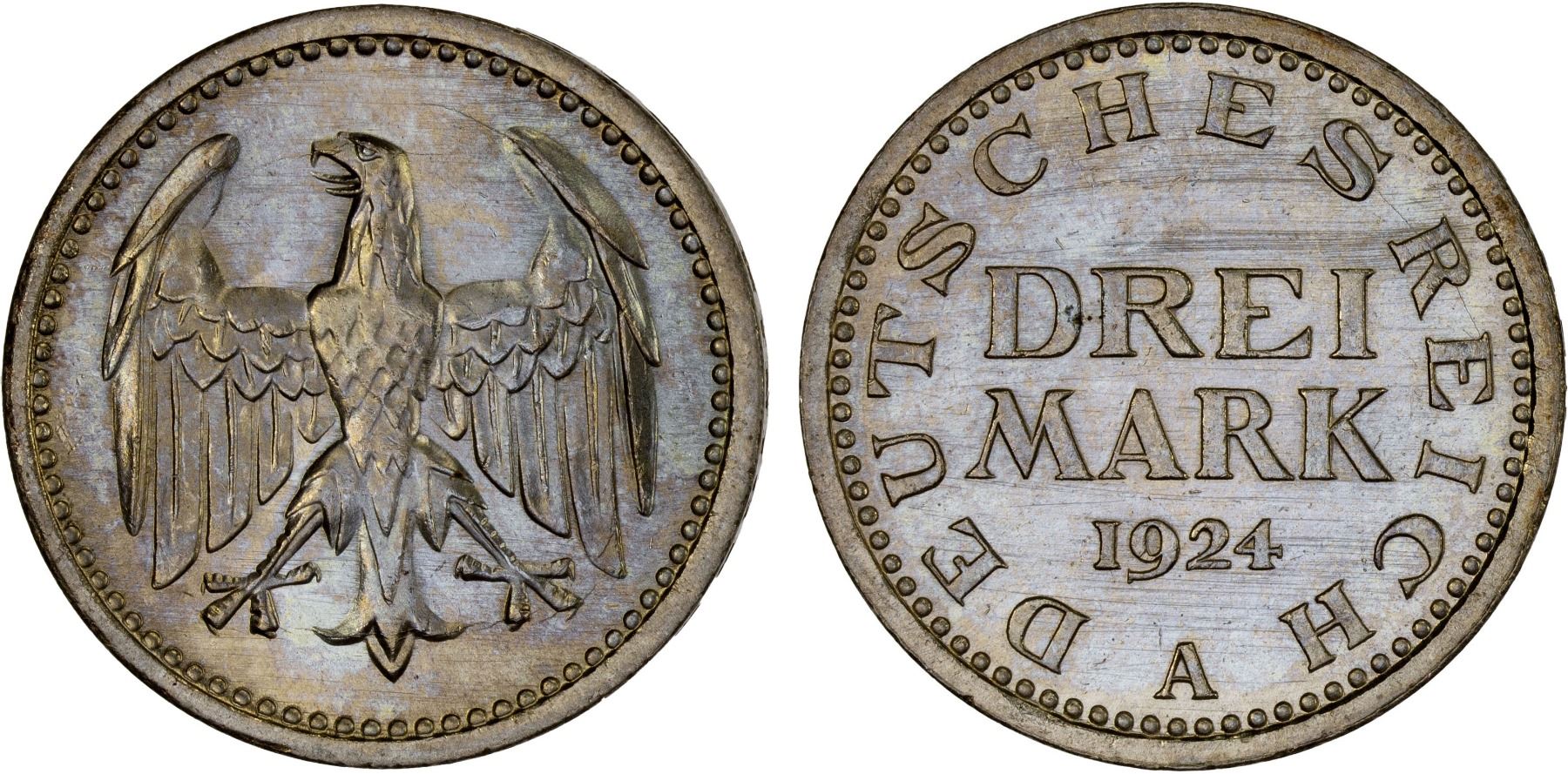 GERMANY: Weimar Republic, AR 3 mark, 1924-A, KM-43, hairlined, very lustrous, Unc, ex Almer H. Orr III Collection.