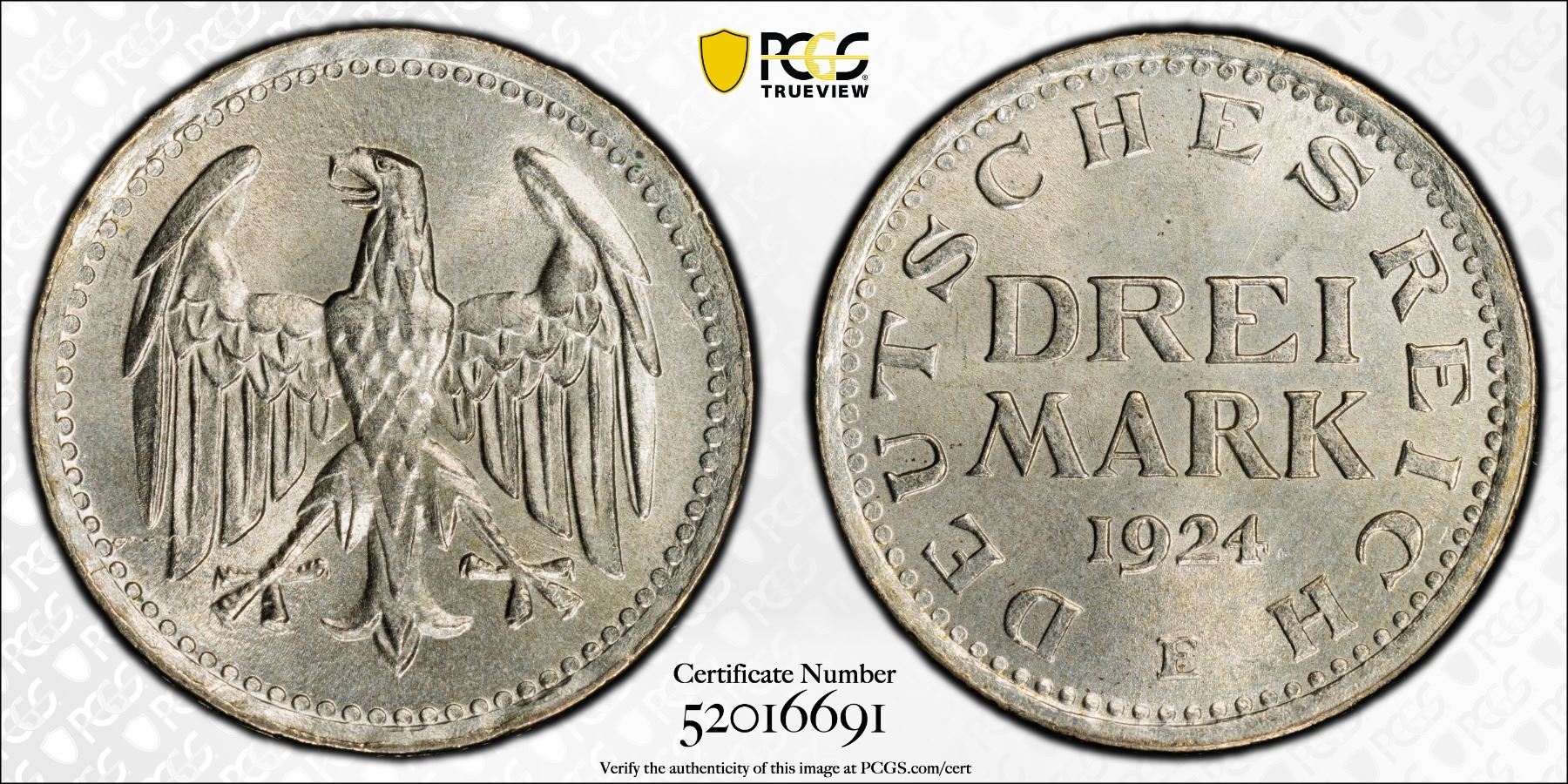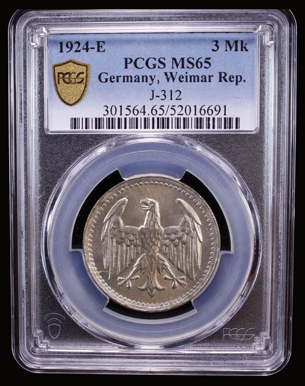 GERMANY: Weimar Republic, AR 3 mark, 1924-E, PCGS MS65