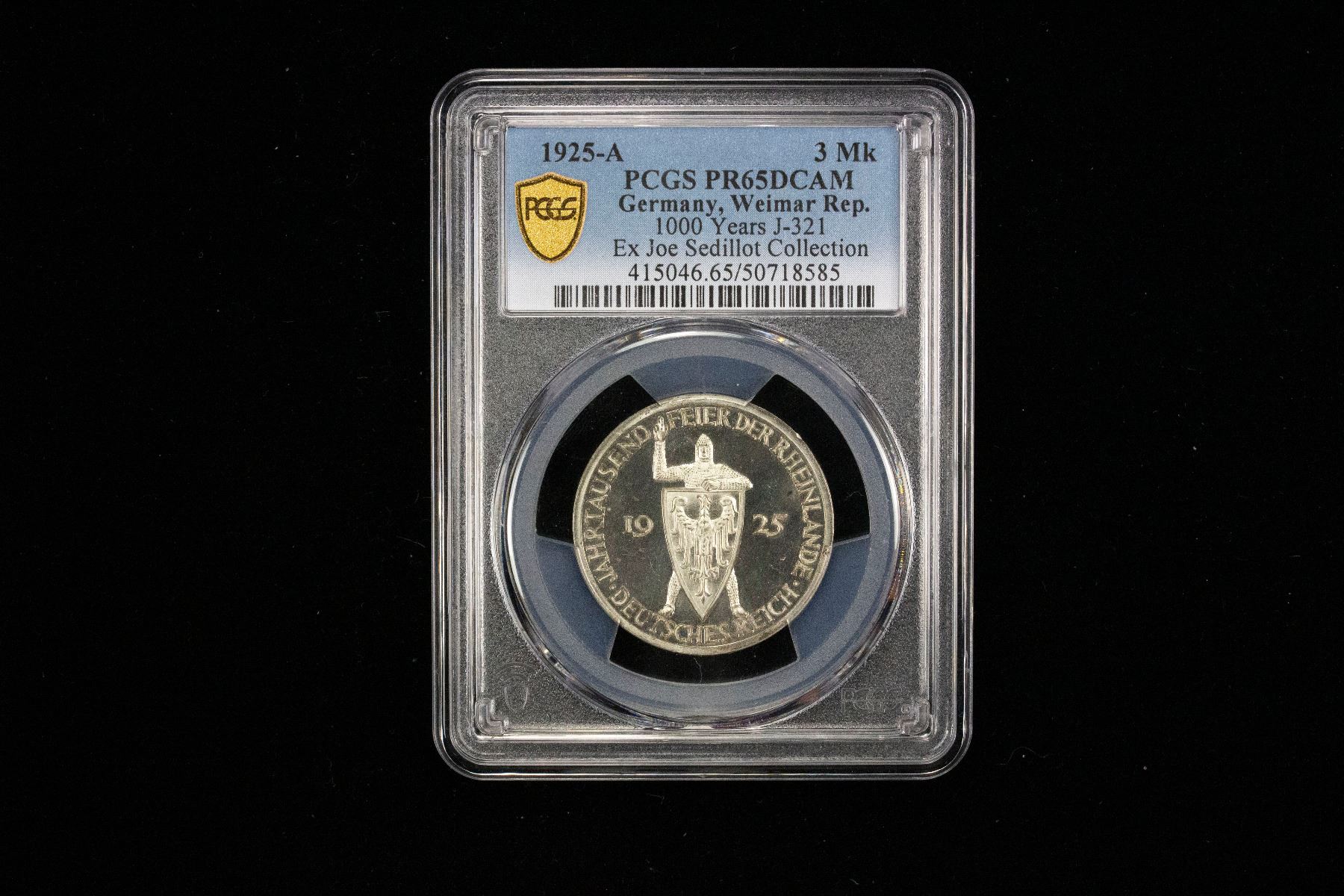 GERMANY: Weimar Republic, AR 3 reichsmark, 1925-A, KM-46, Y-50, J-321, commemorating the 1000th Year of the Rhineland, medallic alignment, a superb deeply reflective proof example! PCGS graded Proof 65 DCAM, ex Joe Sedillot Collection.