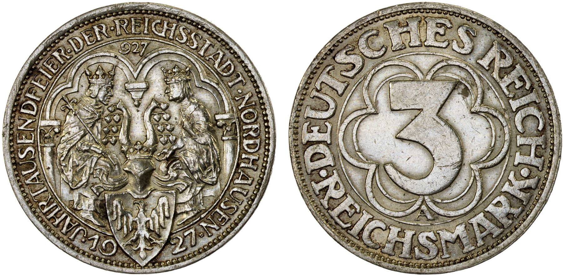 GERMANY: Weimar Republic, AR 3 reichsmark, 1927-A, KM-52, 1000th Anniversry of the Founding of Nordhausen, lightly cleaned obverse, Choice XF, ex Almer H. Orr III Collection.