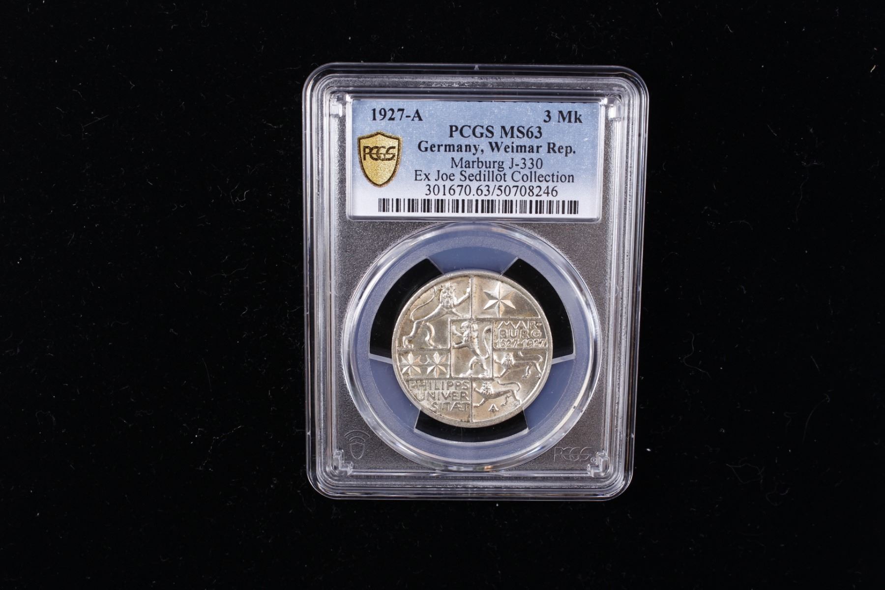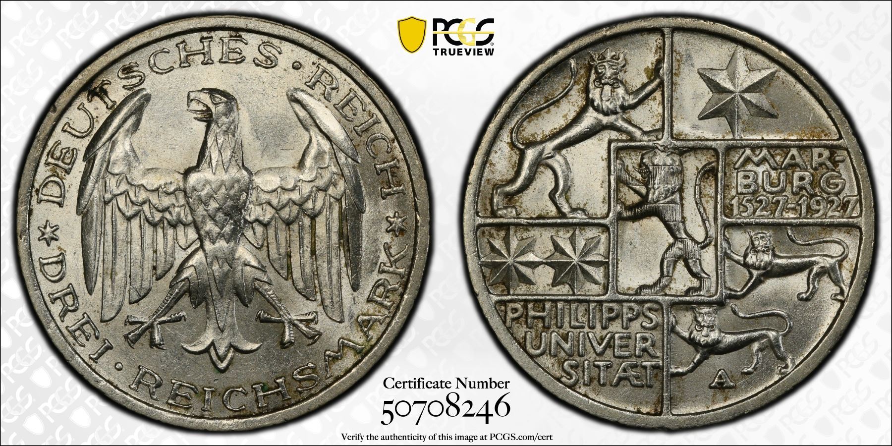 GERMANY: Weimar Republic, AR 3 reichsmark, 1927-A, KM-53, Y-56, J-330, 400th Anniversary of Philipps University in Marburg, a lovely lustrous example! PCGS graded MS63, ex Joe Sedillot Collection.