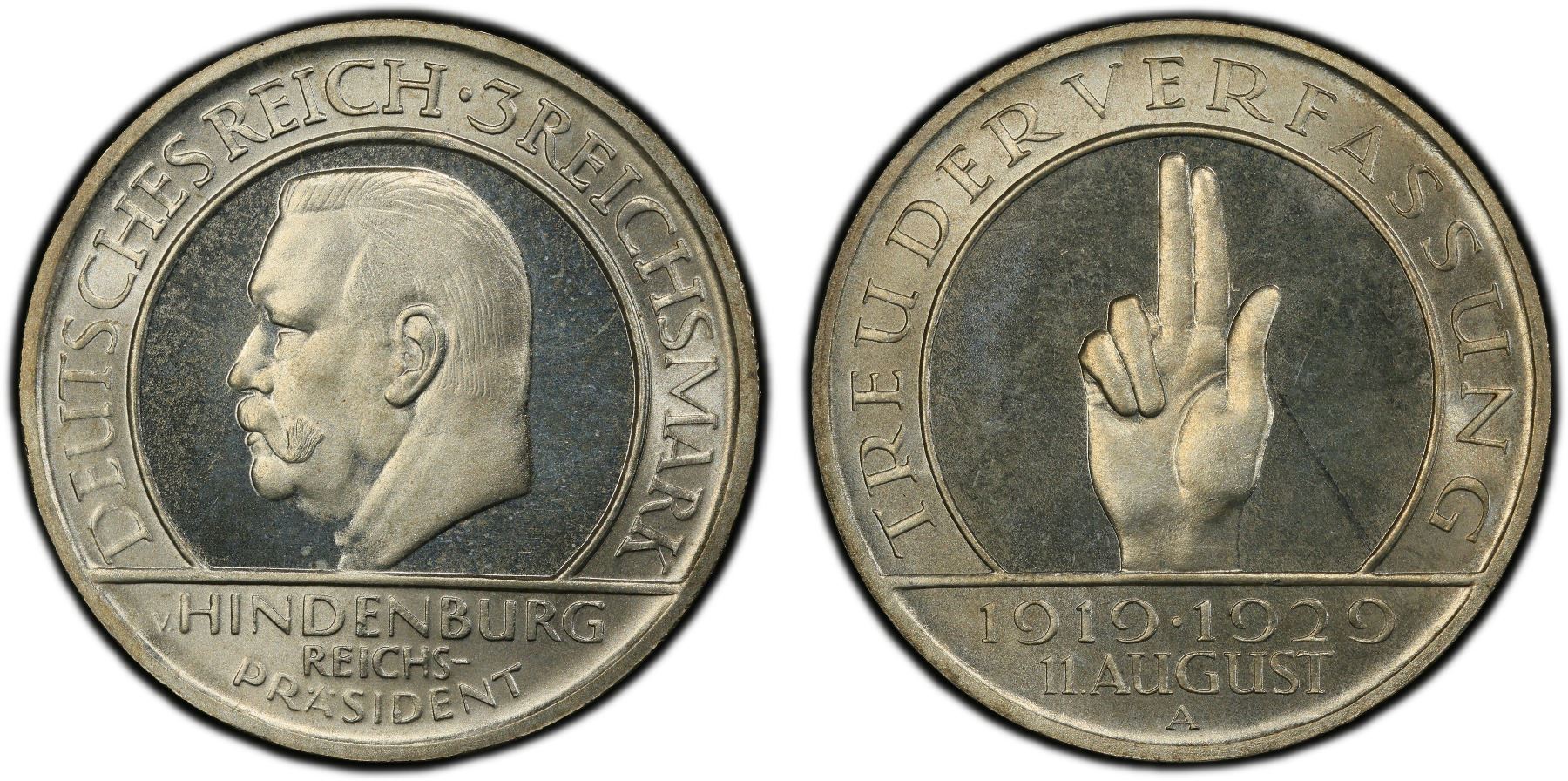 GERMANY: Weimar Republic, AR 3 reichsmark, 1929-A, KM-63, Y-65, J-340, 10th Anniversary of the Weimar Constitution - President Paul von Hindenburg, a fantastic proof quality example! PCGS graded Proof 66, ex Joe Sedillot Collection.