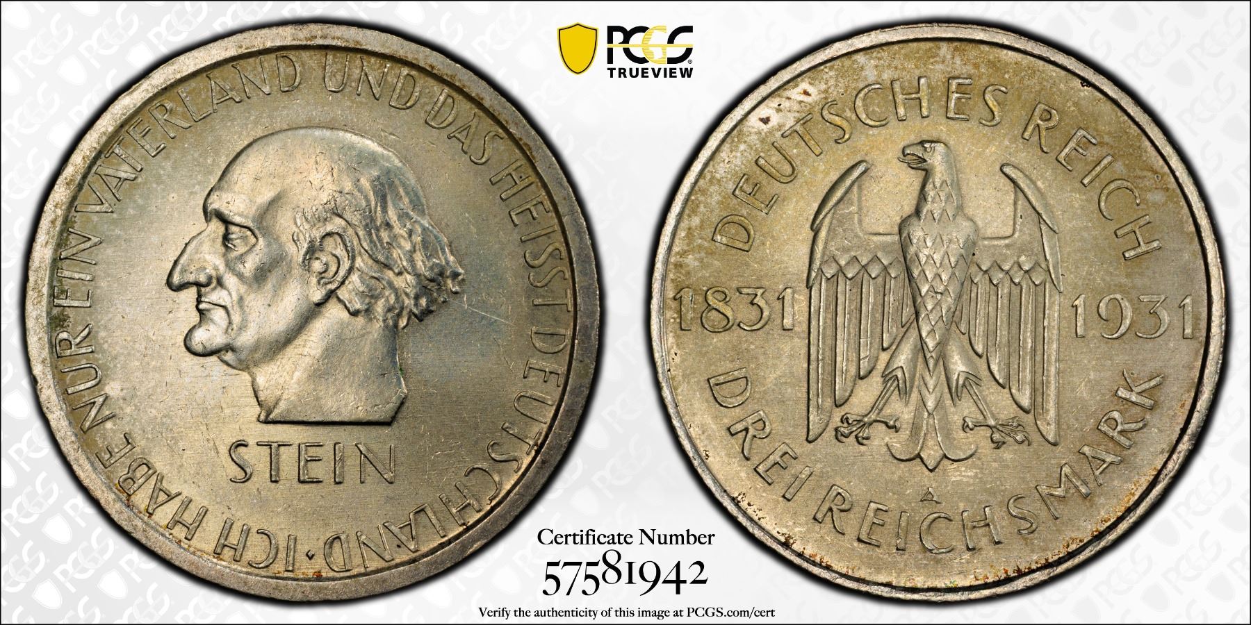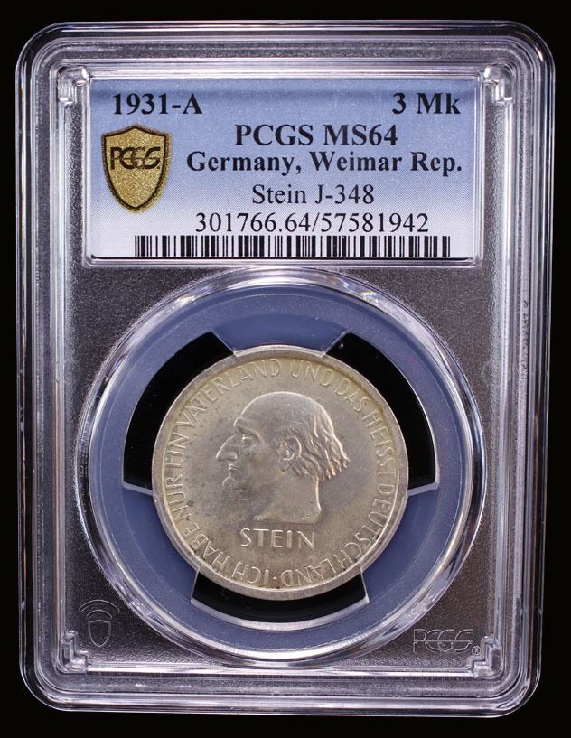GERMANY: Weimar Republic, AR 3 reichsmark, 1931-A, KM-73, J-348, 100th Anniversary - Death of Heinrich vom Stein, a wonderful lustrous example! PCGS graded MS64.