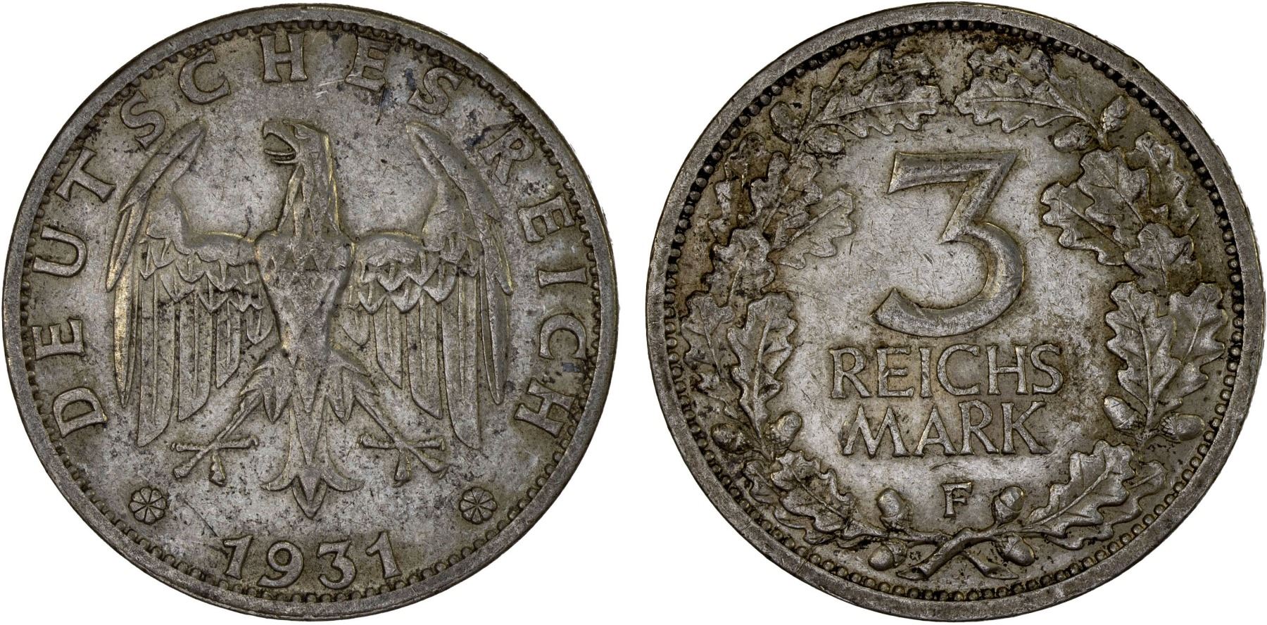 GERMANY: Weimar Republic, AR 3 reichsmark, 1931-F, KM-74, Y-48.1, scarce type, VF-XF, ex Almer H. Orr III Collection.