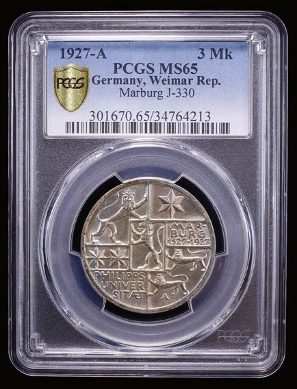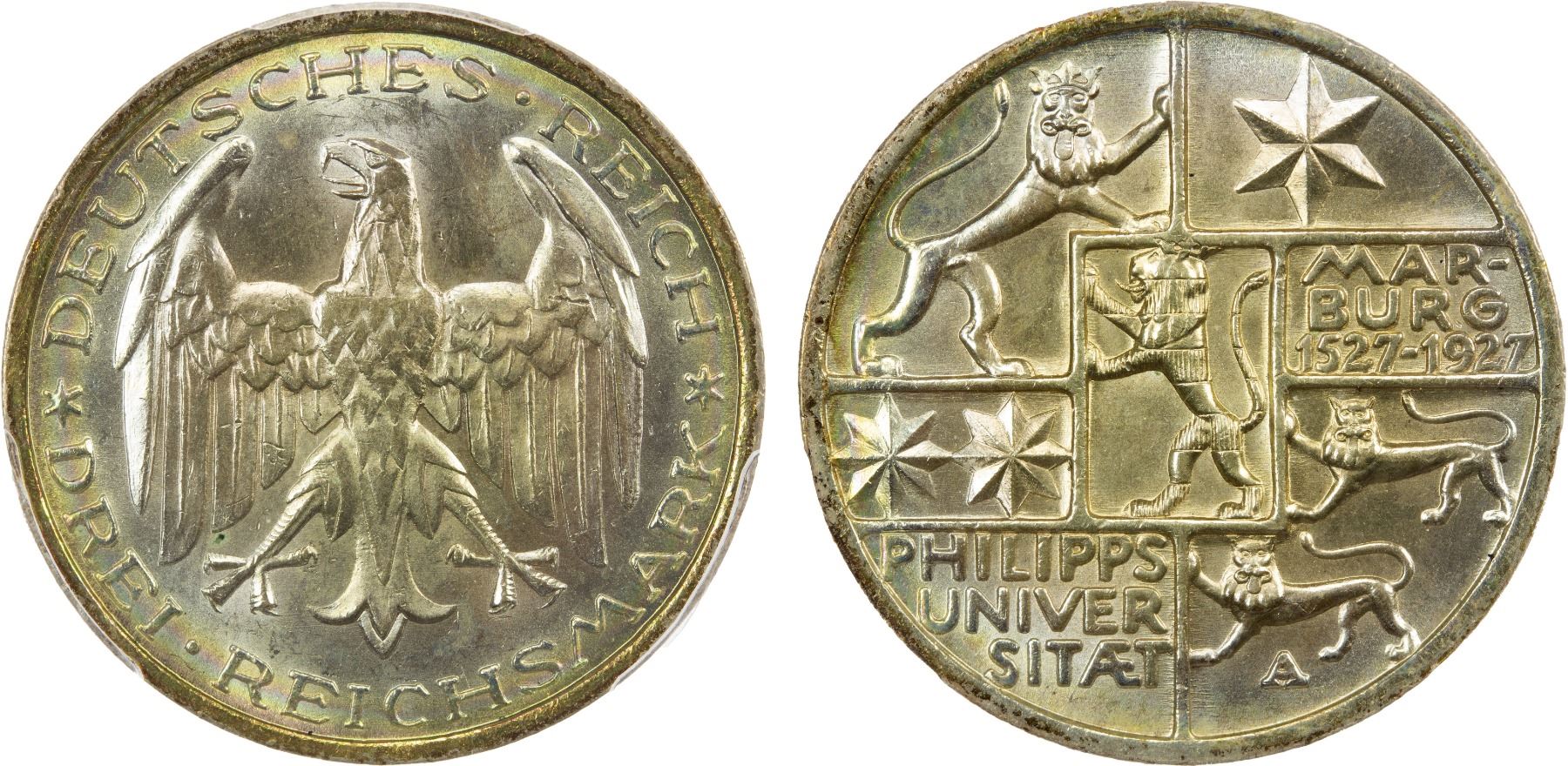 GERMANY: Weimar Republic, AR 3 reichsmark, Berlin, 1927-A, KM-53, Jaeger-330, 400th Anniversary-Philipps University in Marburg, attractive light toning, PCGS graded MS65.