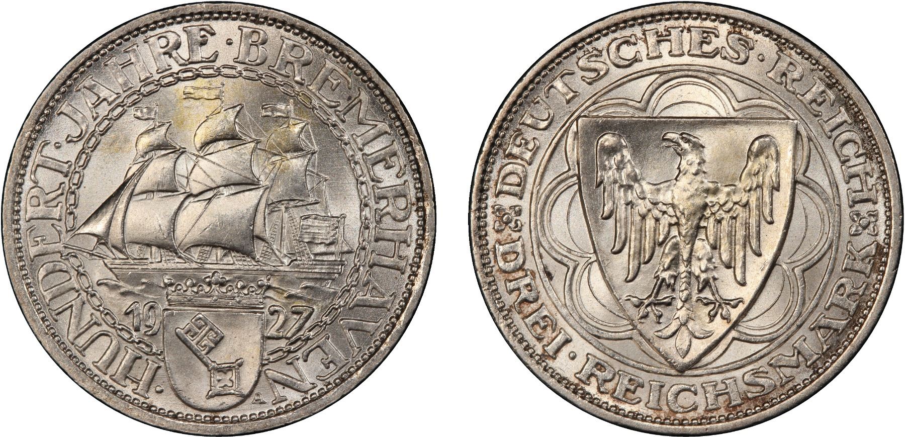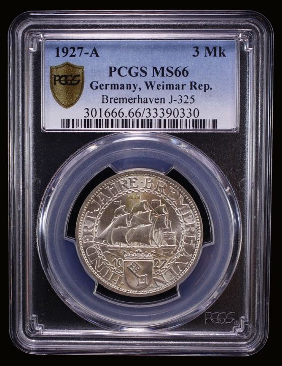 GERMANY: Weimar Republic, AR 3 reichsmark, Berlin, 1927-A, KM-50, Jaeger-325, 100th Anniversary of Bremerhaven, lustrous, a lovely example! PCGS graded MS66.