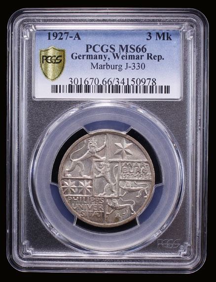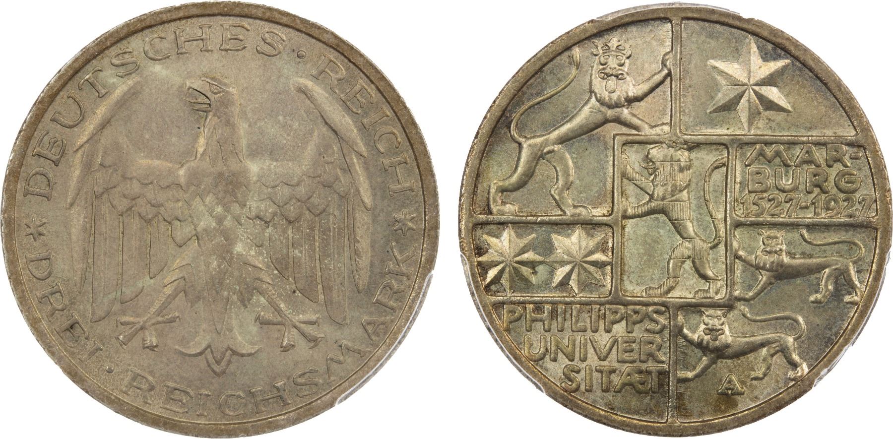 GERMANY: Weimar Republic, AR 3 reichsmark, Berlin, 1927-A, KM-53, Jaeger-330, 400th Anniversary-Philipps University in Marburg, lightly toned, a lovely example! PCGS graded MS66.