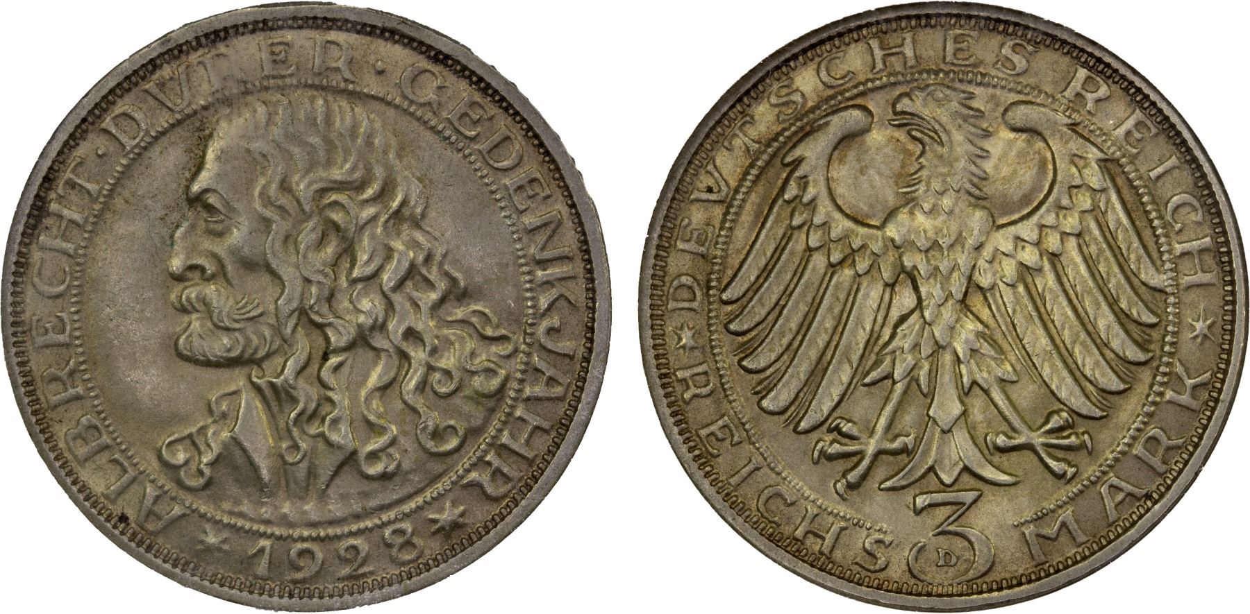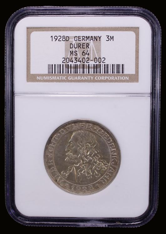 GERMANY: Weimar Republic, AR 3 reichsmark, Munich, 1928-D, KM-58, Jaeger-332, 400th Anniversary-Death of Albrecht Dürer, pleasing light tone, old NGC holder, NGC graded MS64.