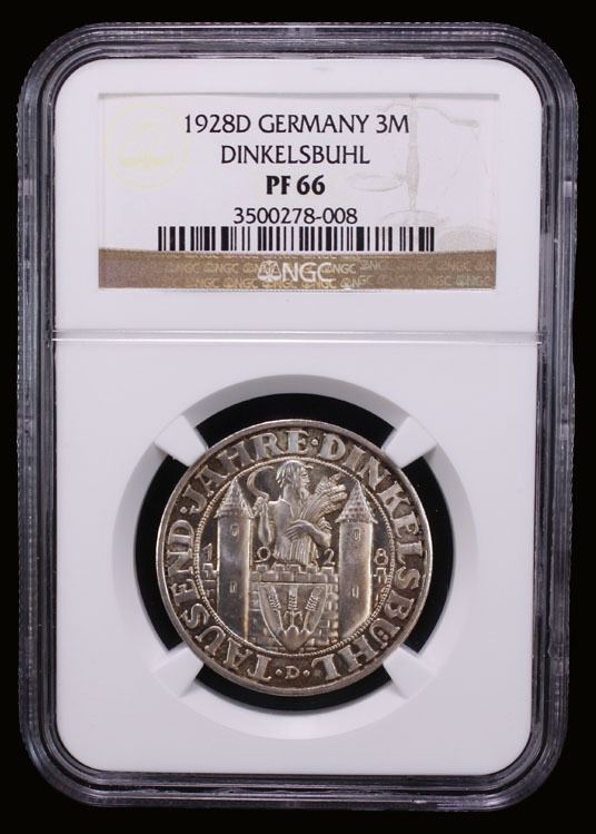 GERMANY: Weimar Republic, AR 3 reichsmark, Munich, 1928-D, KM-59, Jaeger-334, 100th Anniversary-Founding of Dinkelsbühl, lightly toned, mirror finish, a lovely example! NGC graded Proof 66.