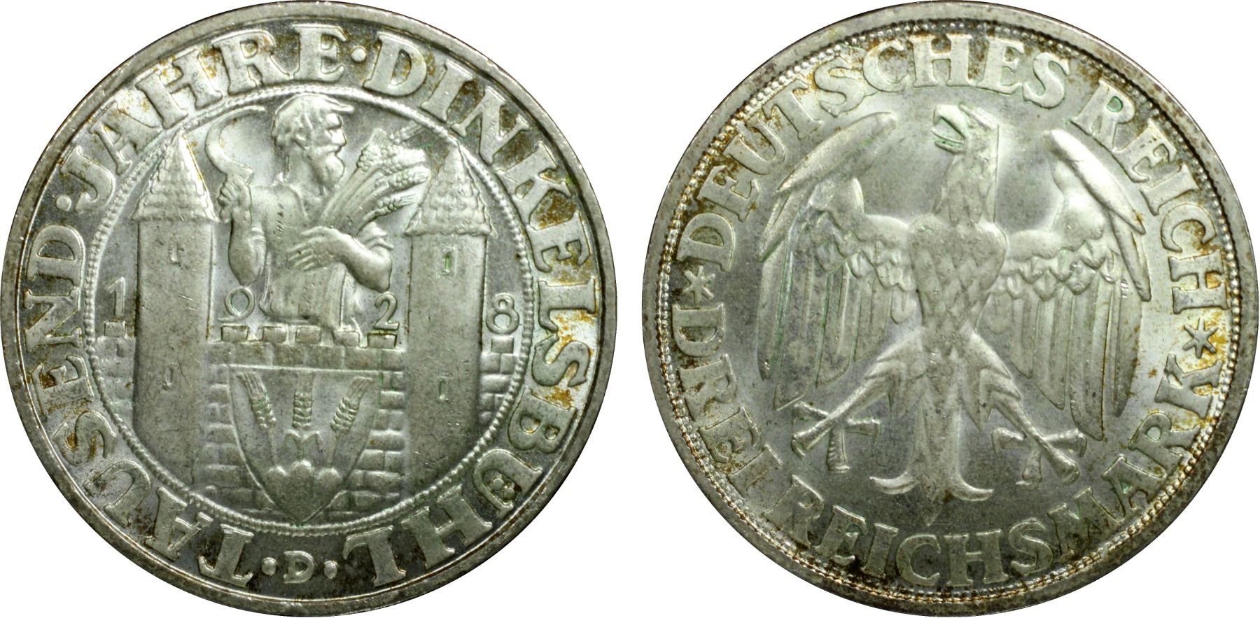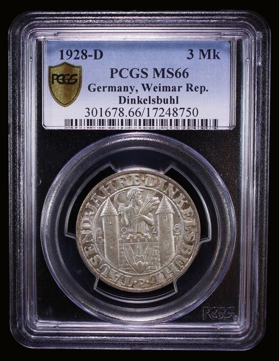 GERMANY: Weimar Republic, AR 3 reichsmark, Munich, 1928-D, KM-59, Jaeger-334, 100th Anniversary-Founding of Dinkelsbühl, light peripheral toning, a lovely example! PCGS graded MS66.
