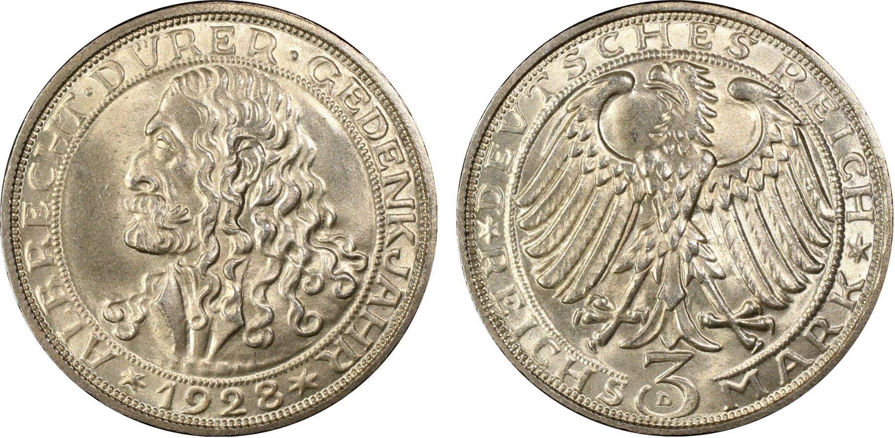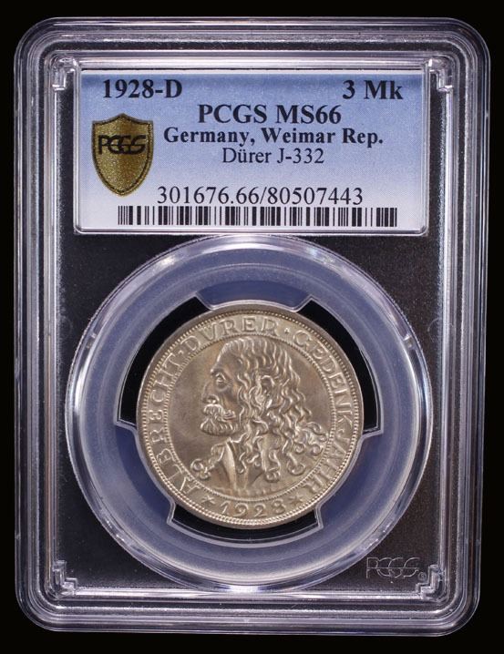 GERMANY: Weimar Republic, AR 3 reichsmark, Munich, 1928-D, KM-58, Jaeger-332, 400th Anniversary-Death of Albrecht Dürer, good eye appeal, a lovely example! PCGS graded MS66.