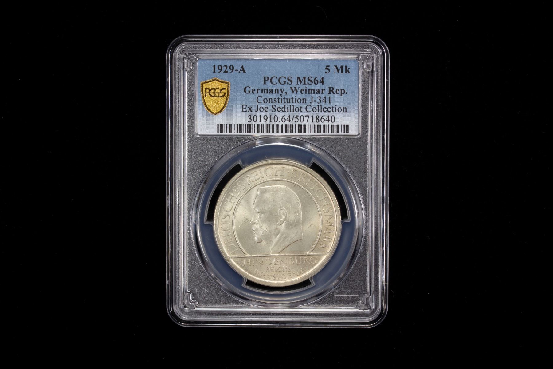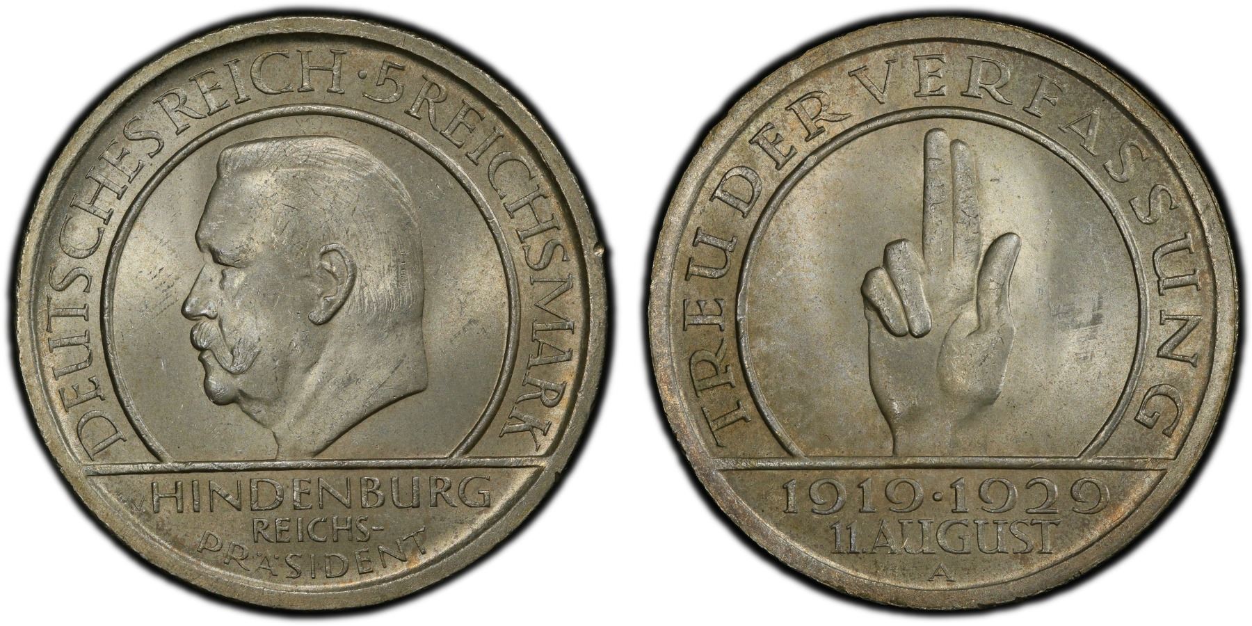 GERMANY: Weimar Republic, AR 5 mark, 1929-A, KM-64, Y-66, Dav-971, J-341, commemorating the 10th Anniversary of the Weimar Constitution, a wonderful lustrous mint state example! PCGS graded MS64, ex Joe Sedillot Collection.