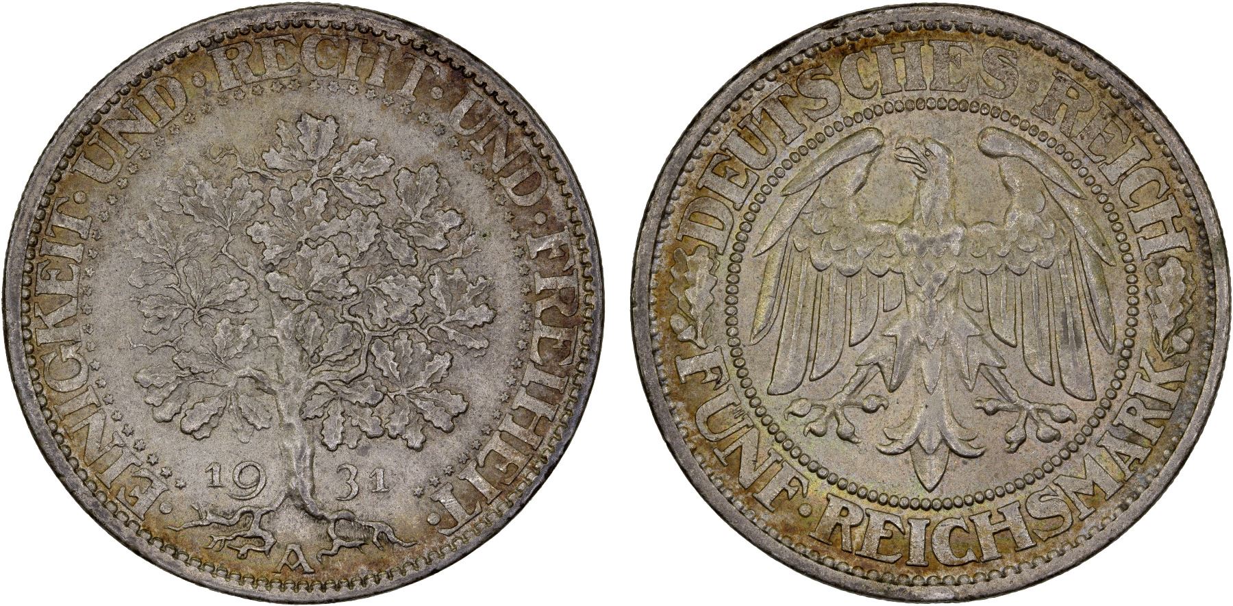 GERMANY: Weimar Republic, AR 5 mark, 1931-A, KM-56, Oak tree type, nice peripheral toning, Choice XF.