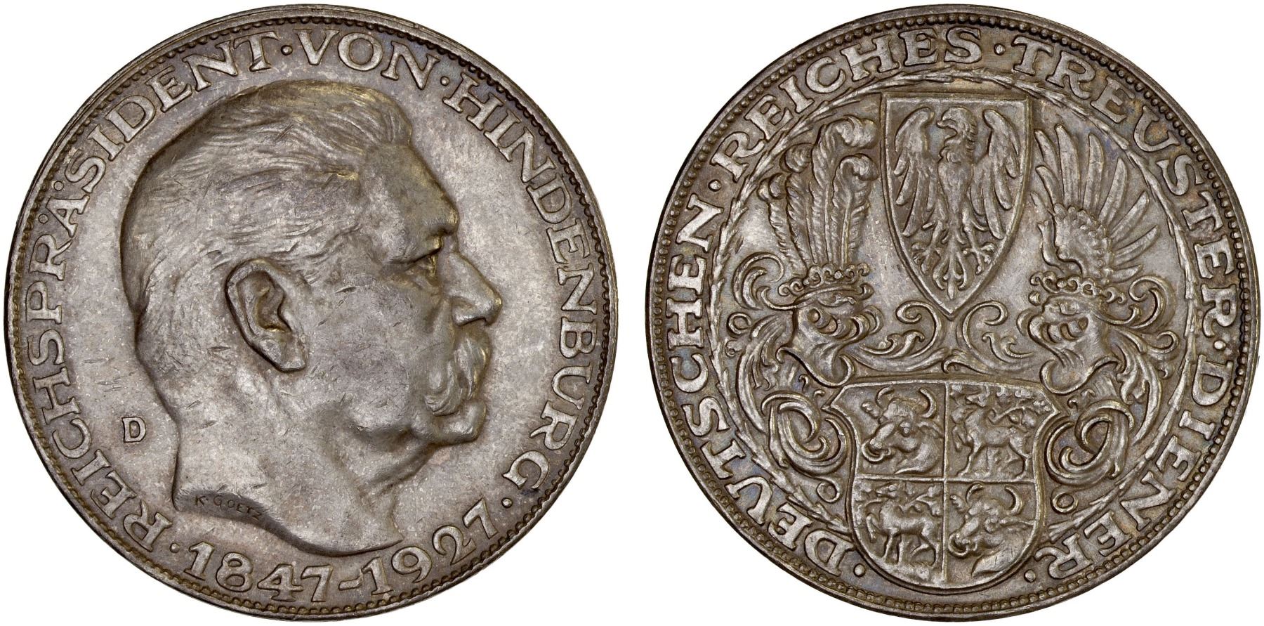 GERMANY: Weimar Republic, AR 5 mark (25.00g), 1927-D, Bruce-X1, Von Hindenburg, Karl Goetz medallic issue, lightly toned, XF-AU, ex Almer H. Orr III Collection.