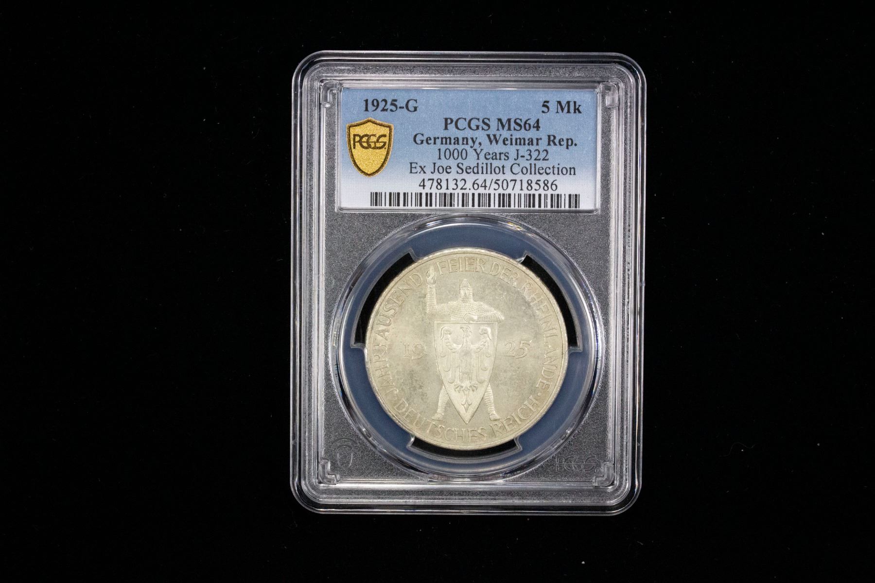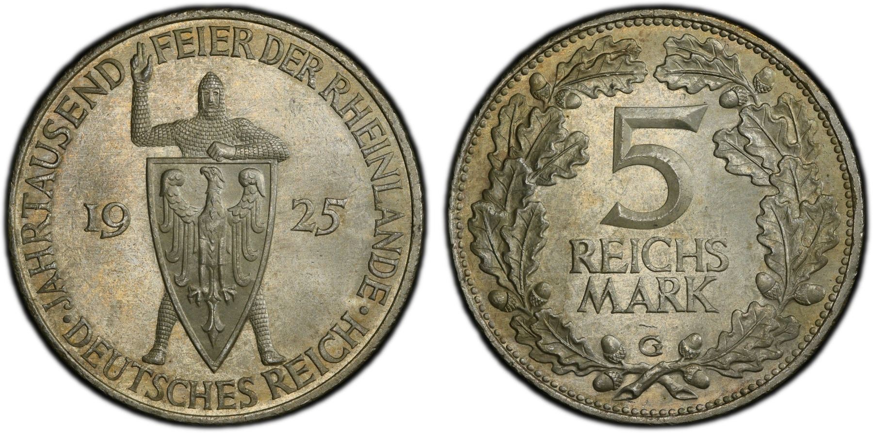 GERMANY: Weimar Republic, AR 5 reichsmark, 1925-G, KM-47, Y-51, J-322, Dav-965, commemorating the 1000th Year of the Rhineland, medallic alignment, a wonderful lustrous mint state example! PCGS graded MS64, ex Joe Sedillot Collection.