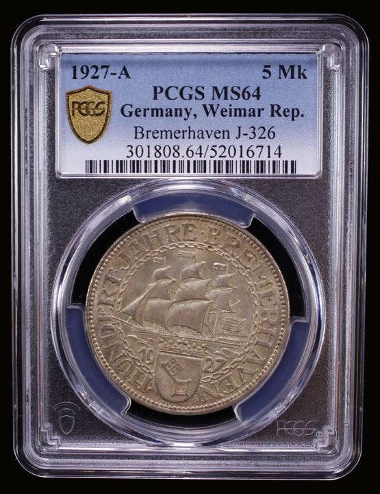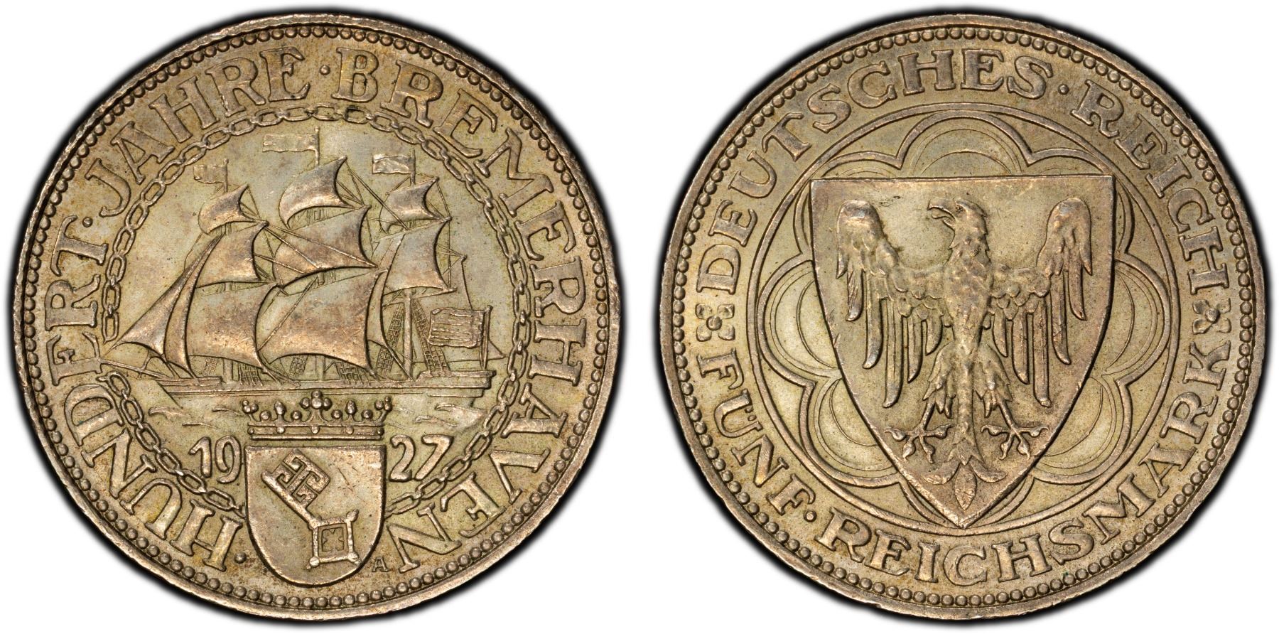 GERMANY: Weimar Republic, AR 5 reichsmark, 1927-A, KM-51, J-326, 100th Anniversary of Bremerhaven, a wonderful mint state example! PCGS graded MS64.