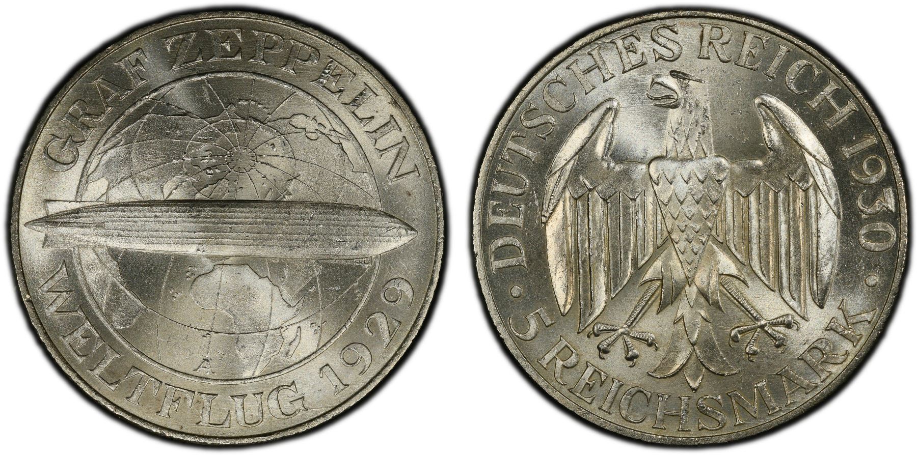 GERMANY: Weimar Republic, AR 5 reichsmark, 1930-A, J-343, commemorating the Airship Graf Zeppelin's Around-the-World Flight, a superb lustrous example! PCGS graded MS66.