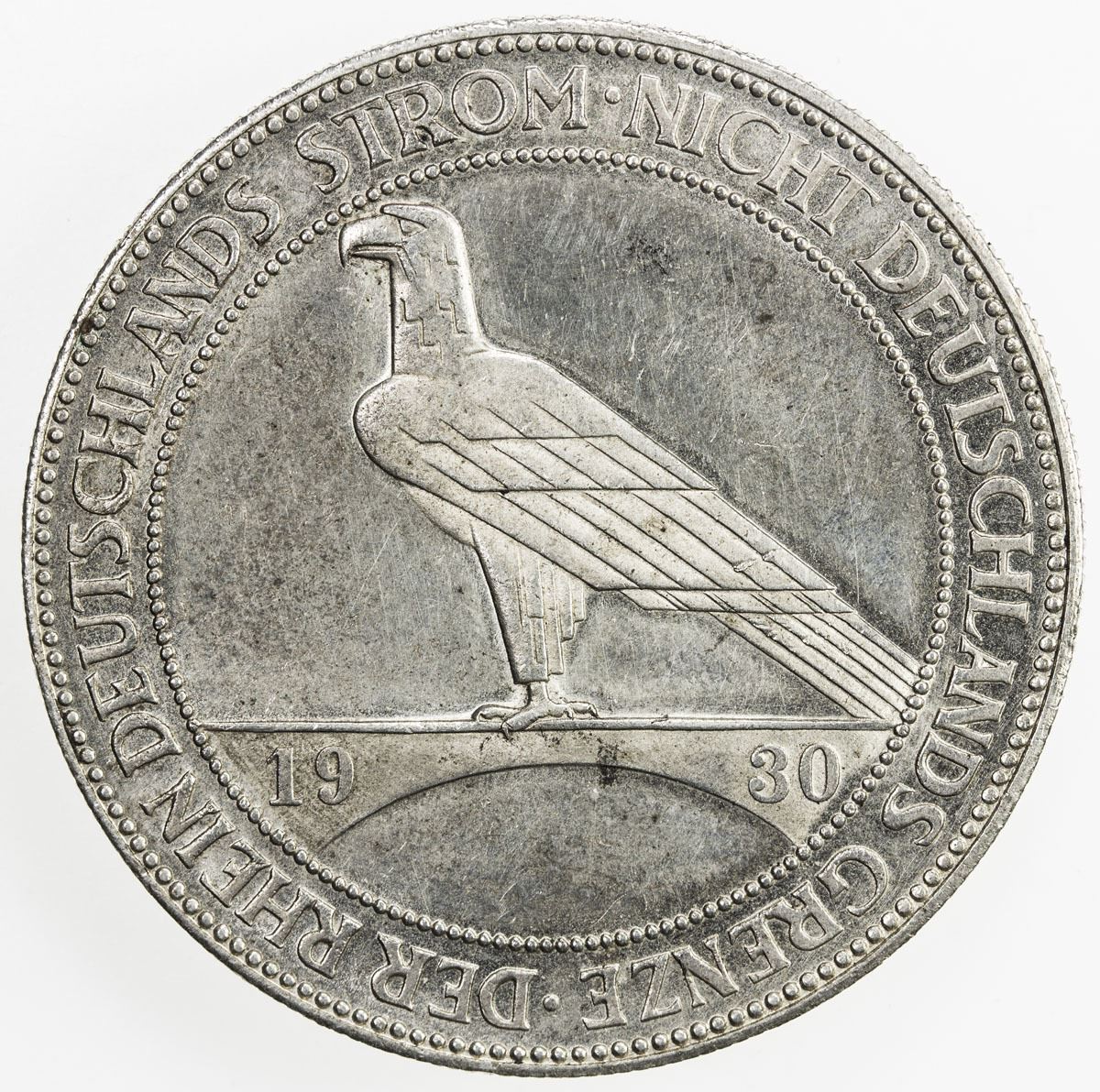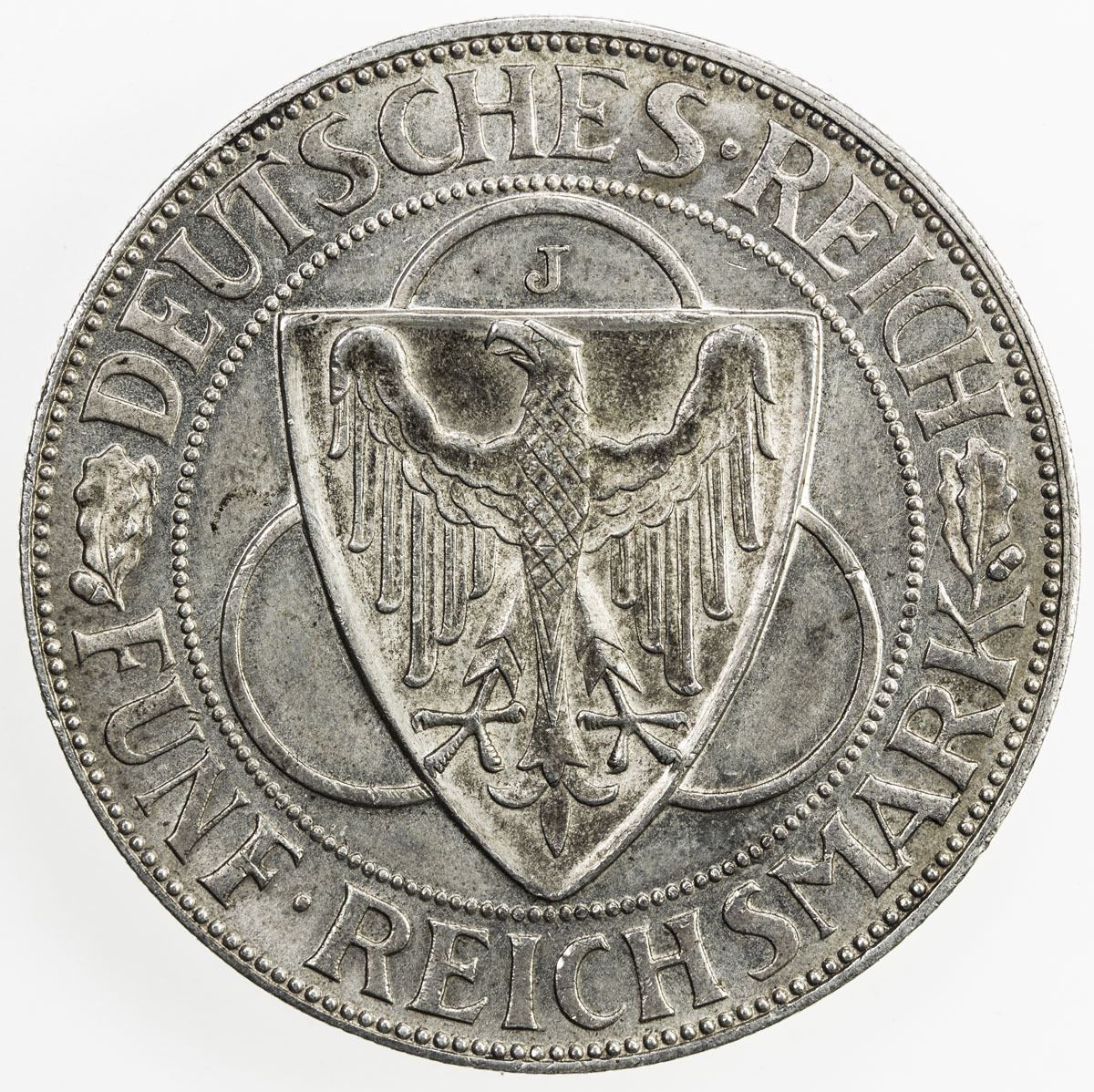 GERMANY: Weimar Republic, AR 5 reichsmark, 1930-J, KM-71, Jaeger-346, Hamburg Mint issue, Liberation of the Rhineland, lightly hairlined, Choice AU.