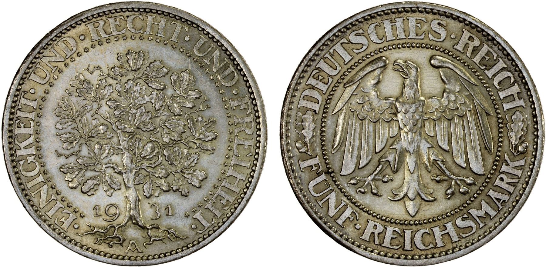 GERMANY: Weimar Republic, AR 5 reichsmark, 1931-A, KM-56, Oak Tree, very lightly rubbed, AU, ex Almer H. Orr III Collection.