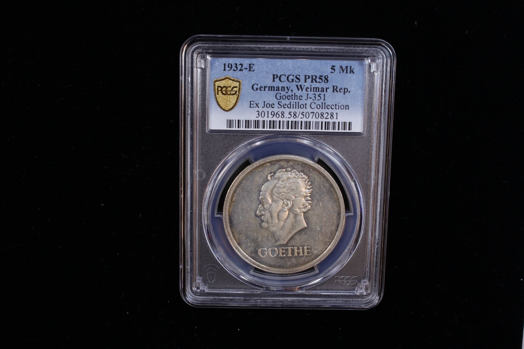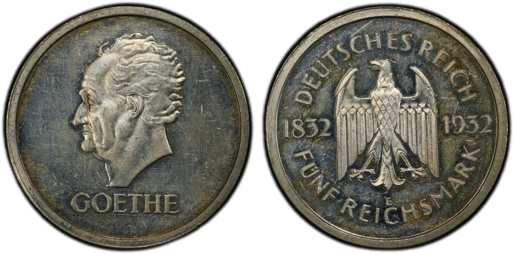 GERMANY: Weimar Republic, AR 5 reichsmark, 1932-E, KM-77, Y-77, J-351, 100th Anniversary of the Death of Goethe, surface hairlines over proof fields, extremely rare in proof with no examples of 1932-E present on CoinArchives! PCGS graded Proof 58, ex Joe Sedillot Collection.