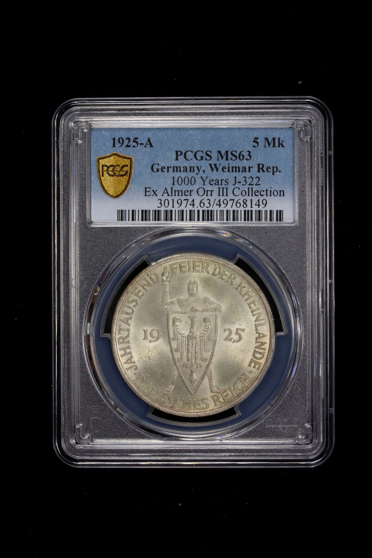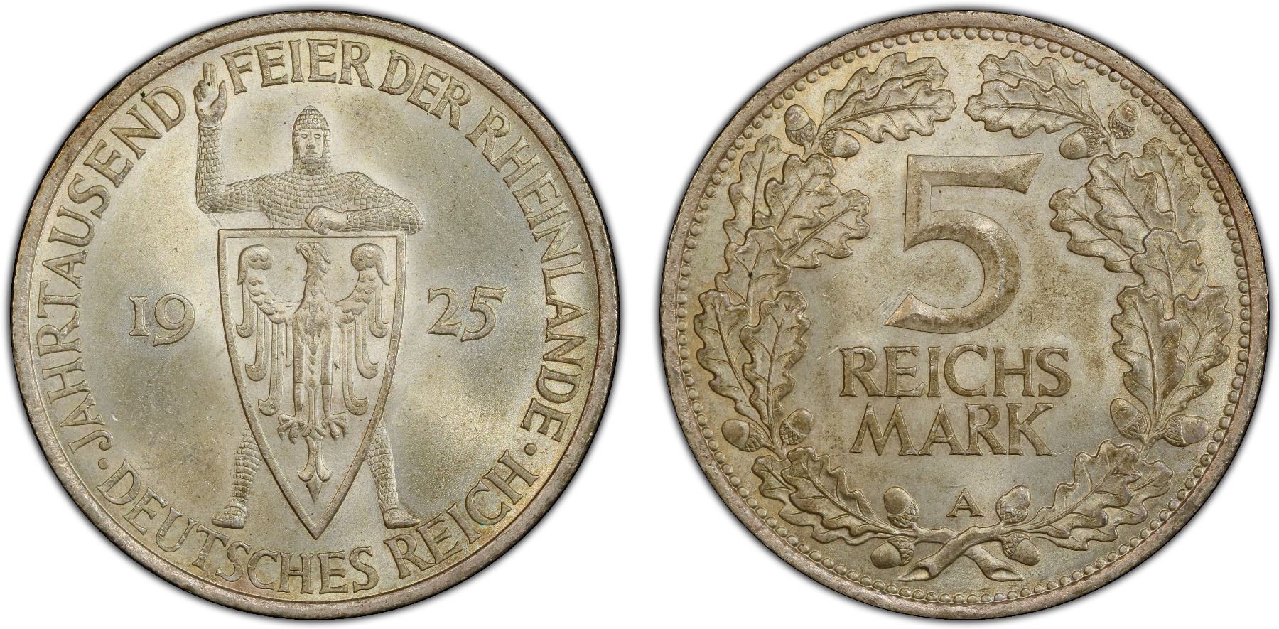 GERMANY: Weimar Republic, AR 5 reichsmark, Berlin, 1925-A, KM-47, J-349, commemorating the 1000th Year of the Rhineland, a lovely lustrous mint state example! PCGS graded MS63, ex Almer H. Orr III Collection.
