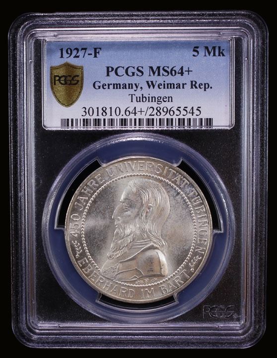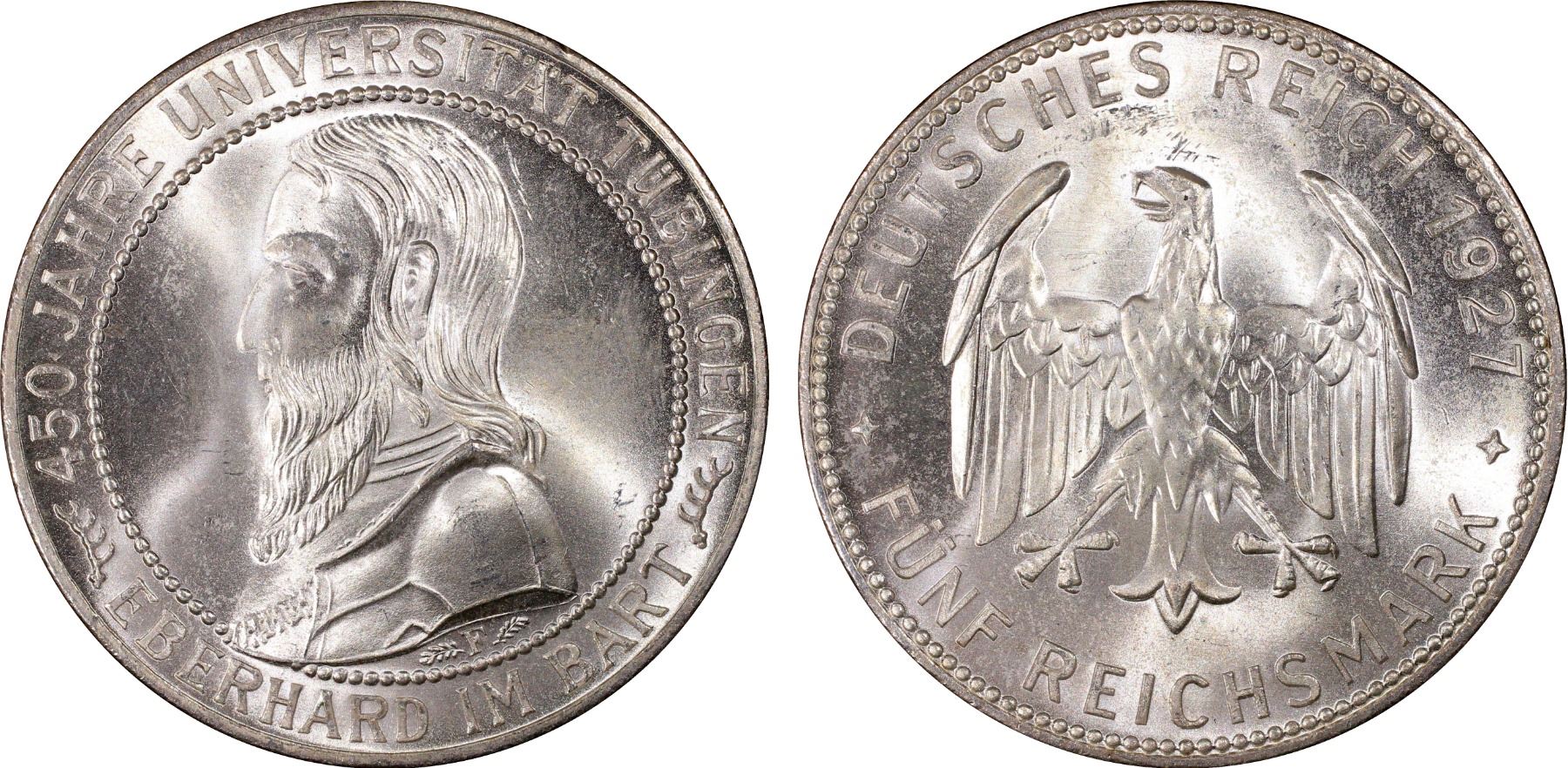GERMANY: Weimar Republic, AR 5 reichsmark, Stuttgart, 1927-F, KM-55, Jaeger-329, 450th Anniversary-University of Tübingen, very lustrous, PCGS graded MS64+.