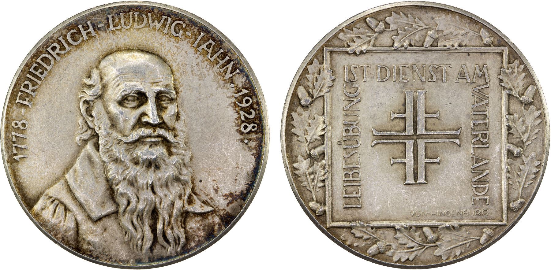 GERMANY: Weimar Republic, AR medal (19.14g), 1928, 36mm unsigned silver medal for the 150th anniversary of Friedrich Ludwig Jahn; 1778 FRIEDRICH LUDWIG JAHN 1928 around bust facing slightly right, wearing coat // LEIBESÜBUNG IST DIENST AM VATERLANDE / VON HINDENBURG legend around "Turnerkreuz" within quadratic plaque; in fields around, oak branches, BAYER. HAUPTMÜNZAMT SILBER 900F on edge. The "Turnerkreuz" is the logo of the German Turner movement of the 19th century and is still used by the Deutscher Turner-Bund (DTB), the umbrella organisation of the german gymnastics societies. It consists of four large F, standing for the motto "Frisch, fromm, fröhlich, frei", arranged in a cross-shaped form.