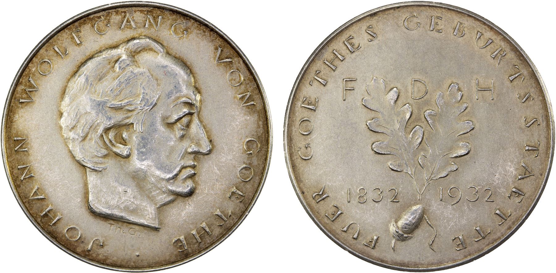 GERMANY: Weimar Republic, AR medal (19.51g), 1932, Förschner-85, 36mm silver medal by Theodor Georgii for the Centennial of the Death of Goethe; JOHANN WOLFGANG VON GOETHE around bust of Goethe, designer's initials TH. G. below // FUER GOETHES GEBURTSSTAETTE around acorn with two acorn leaves above, date 1832 1932 either side, BAYER. HAUPTMÜNZAMT SILBER 900F on edge, AU.