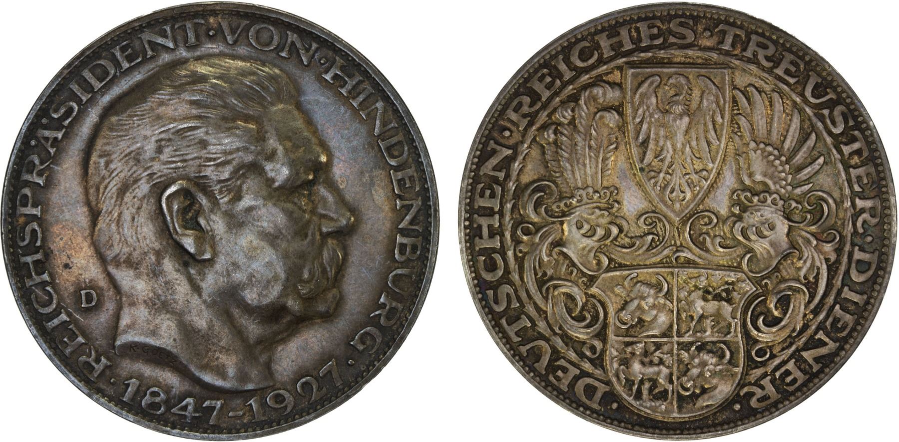 GERMANY: Weimar Republic, AR medal, 1927-D, KM-X1, Kienast-386, 36mm silver medallic issue for the 80th birthday of Paul von Hindenburg by Karl Goetz; REICHSPRÄSIDENT VON HINDENBURG / 1847-1927, around bust of Hindenburg right, K GOETZ on truncation of neck // DEUTSCHEN REICHES TREUSTER DIENER around Coat of arms of Paul von Hindenburg, two facing helmets with plumes to the left and right, Coat of arms of the Weimar Republic above, a thin wreath around, BAYER. HAUPTMÜNZAMT SILBER 900 on edge, AU.