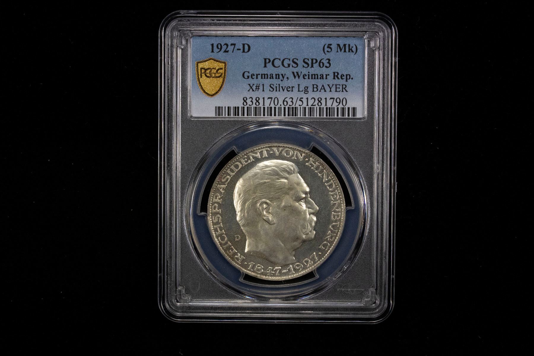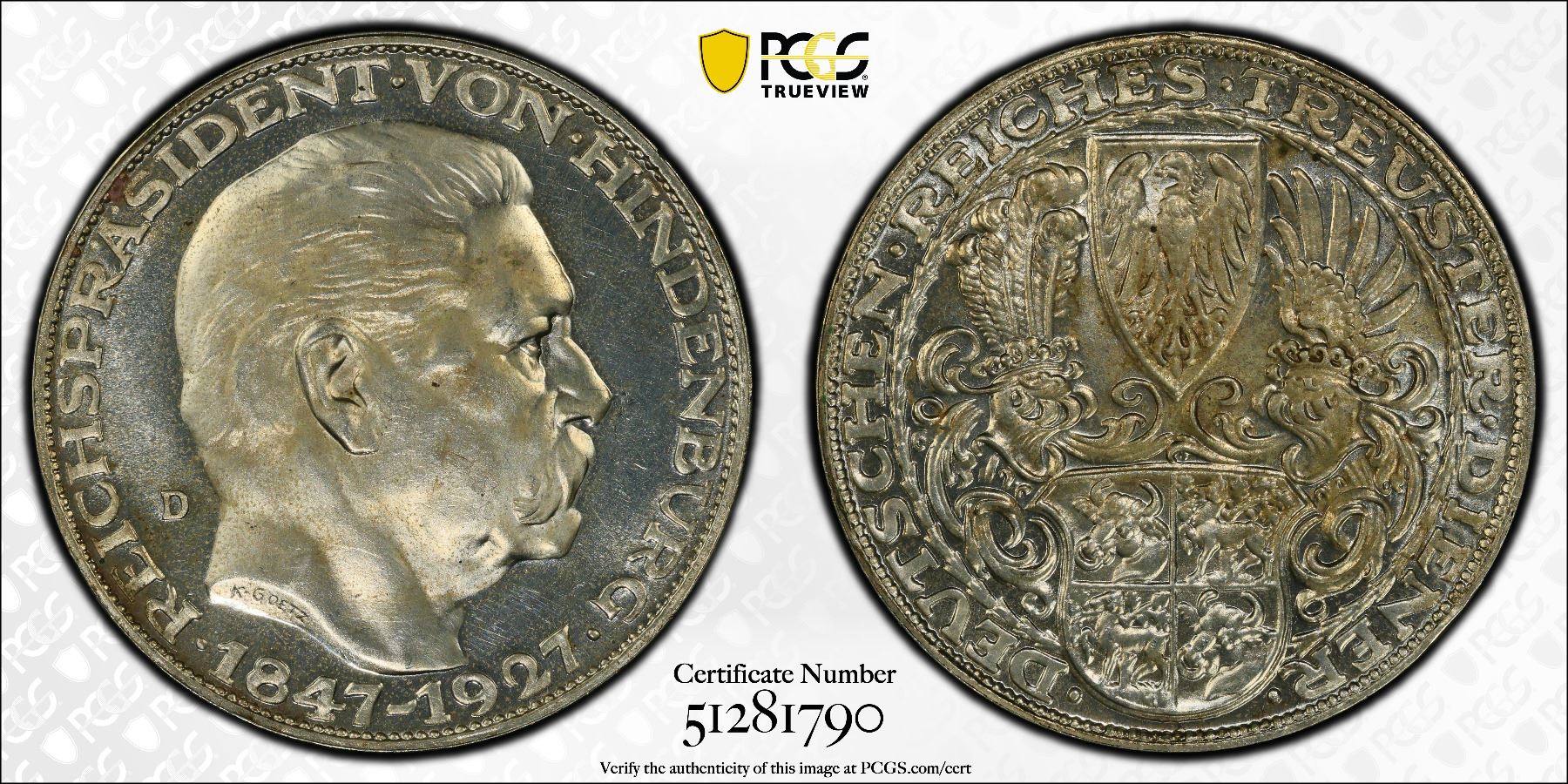 GERMANY: Weimar Republic, AR medal, 1927-D, KM-X1, Kienast-386, 36mm silver medallic issue for the 80th birthday of Paul von Hindenburg by Karl Goetz; REICHSPRÄSIDENT VON HINDENBURG / 1847-1927, around bust of Hindenburg right, K GOETZ on truncation of neck // DEUTSCHEN REICHES TREUSTER DIENER around Coat of arms of Paul von Hindenburg, two facing helmets with plumes to the left and right, Coat of arms of the Weimar Republic above, a thin wreath around, BAYER. HAUPTMÜNZAMT SILBER 900 on edge, a lovely specimen quality example! PCGS graded Specimen 63.