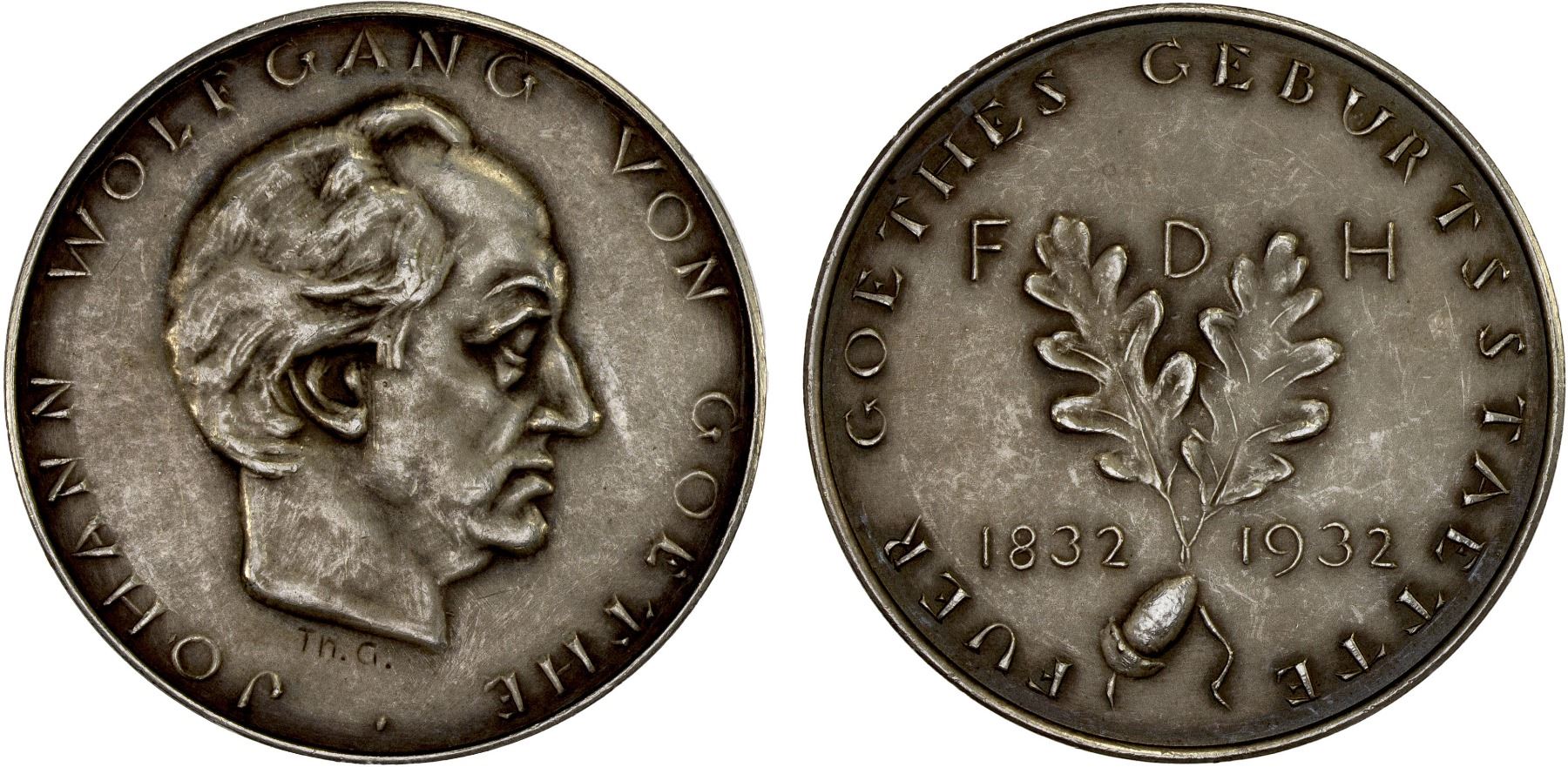 GERMANY: Weimar Republic, AR medal (21.39g), 1932, Förschner-85, 36mm silver medal by Theodor Georgii for the Centennial of the Death of Goethe; JOHANN WOLFGANG VON GOETHE around bust of Goethe, designer's initials TH. G. below // FUER GOETHES GEBURTSSTAETTE around acorn with two acorn leaves above, date 1832 1932 either side, BAYER. HAUPTMÜNZAMT SILBER 900F on edge.