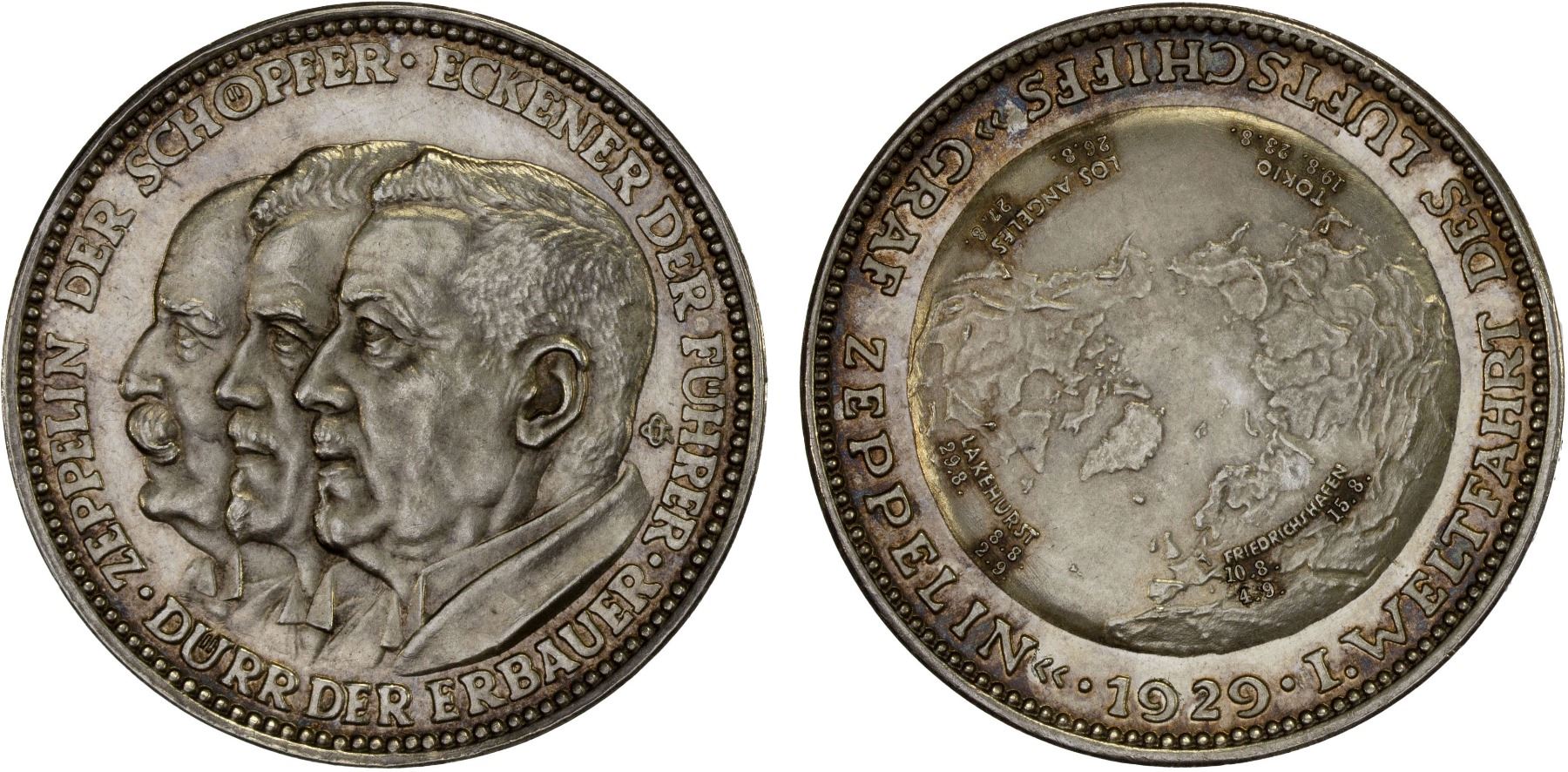 GERMANY: Weimar Republic, AR medal (25.01g), 1929, Kaiser-511, 36mm, medal for the round-the world flight of the Graf Zeppelin, three side-by-side busts left with, ZEPPELIN DER SCHÖPFER / ECKENER DER FÜHRER / DÜRR DER ERBAUER around // globe with landing ports and dates with I. WELTFAHRT DES LUFTSCHIFFS "GRAF ZEPPELIN" and date around, PREUSS. STAATSMUENZE SILBER 900 FEIN on edge, Unc.