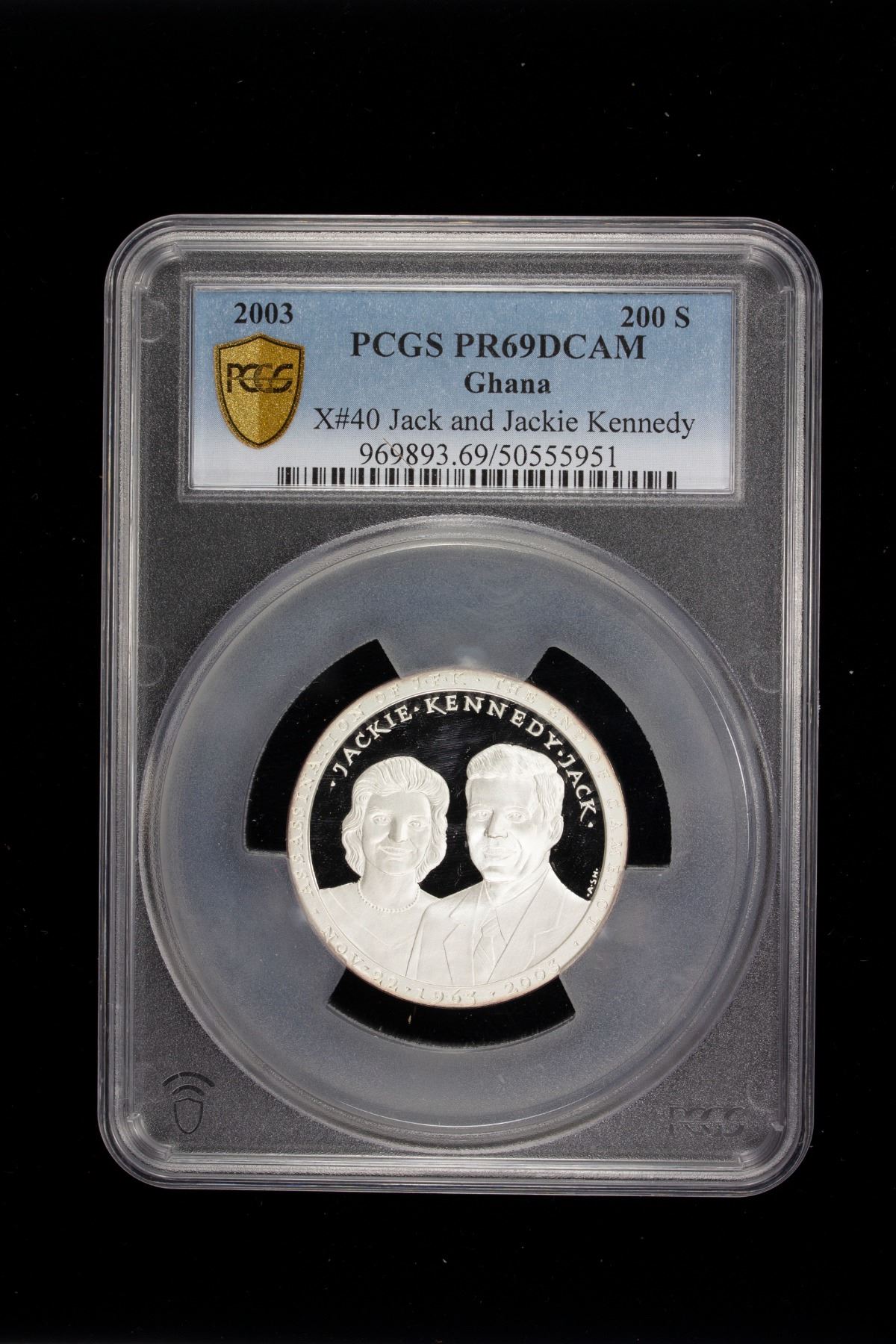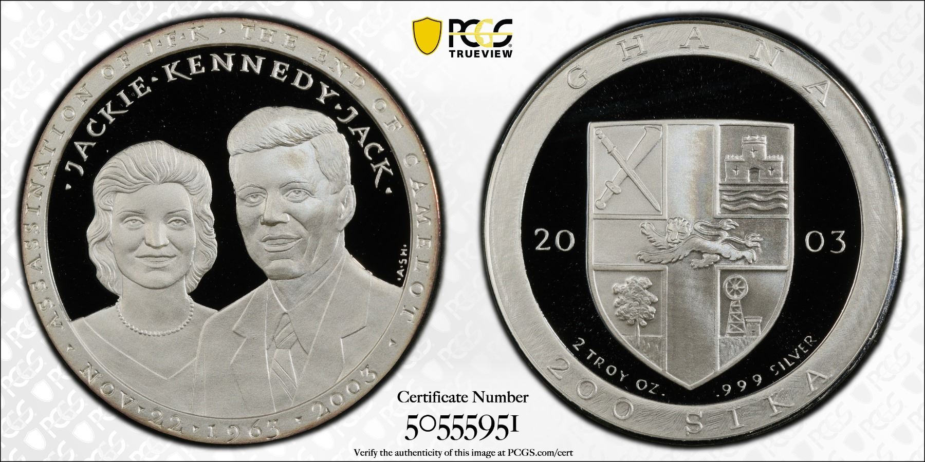 GHANA: Republic, AR 200 sika, 2003, KM-X40, 40th Anniversary of the Assassination of President J. F. Kennedy; The End of Camelot Series - Busts of Jackie and Jack Kennedy facing, contains 2 troy ounces of silver, PCGS graded Proof 69 DCAM.