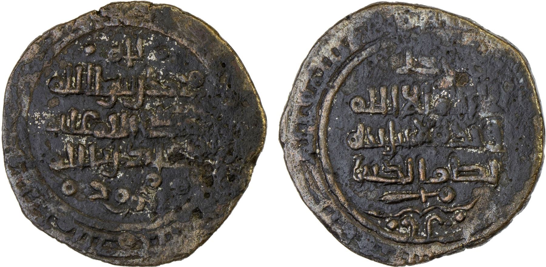 GHAZNAVID: Mahmud, 999-1030, AE narrow flan (2.24g), A-1615, citing Mahmud with his rare title nizam al-din and the caliph al-Qadir; traces of marginal legends, which may include a mint or date (illegible on this piece), VF, RR.