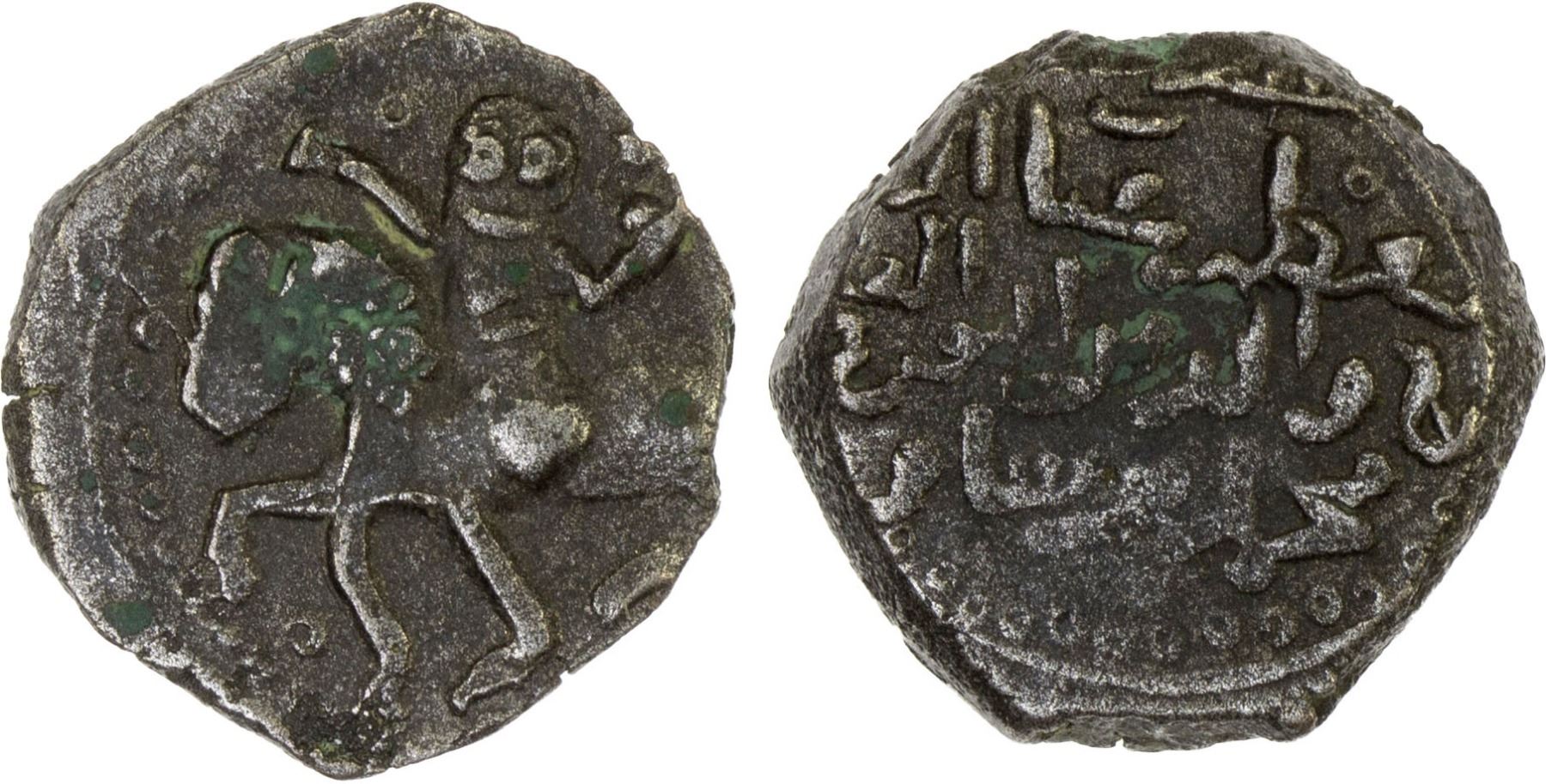 GHORID: Ghiyath al-Din Muhammad, 1163-1203, BI jital (3.05g), NM, ND, A-1758, Tye--, rider with raised arms (and cartoonishly big eyes) on horseback left // al-sultan al-mu'azzam ghiyath al-dunya wa'l-din abu fath muhammad bin sam, Choice VF.