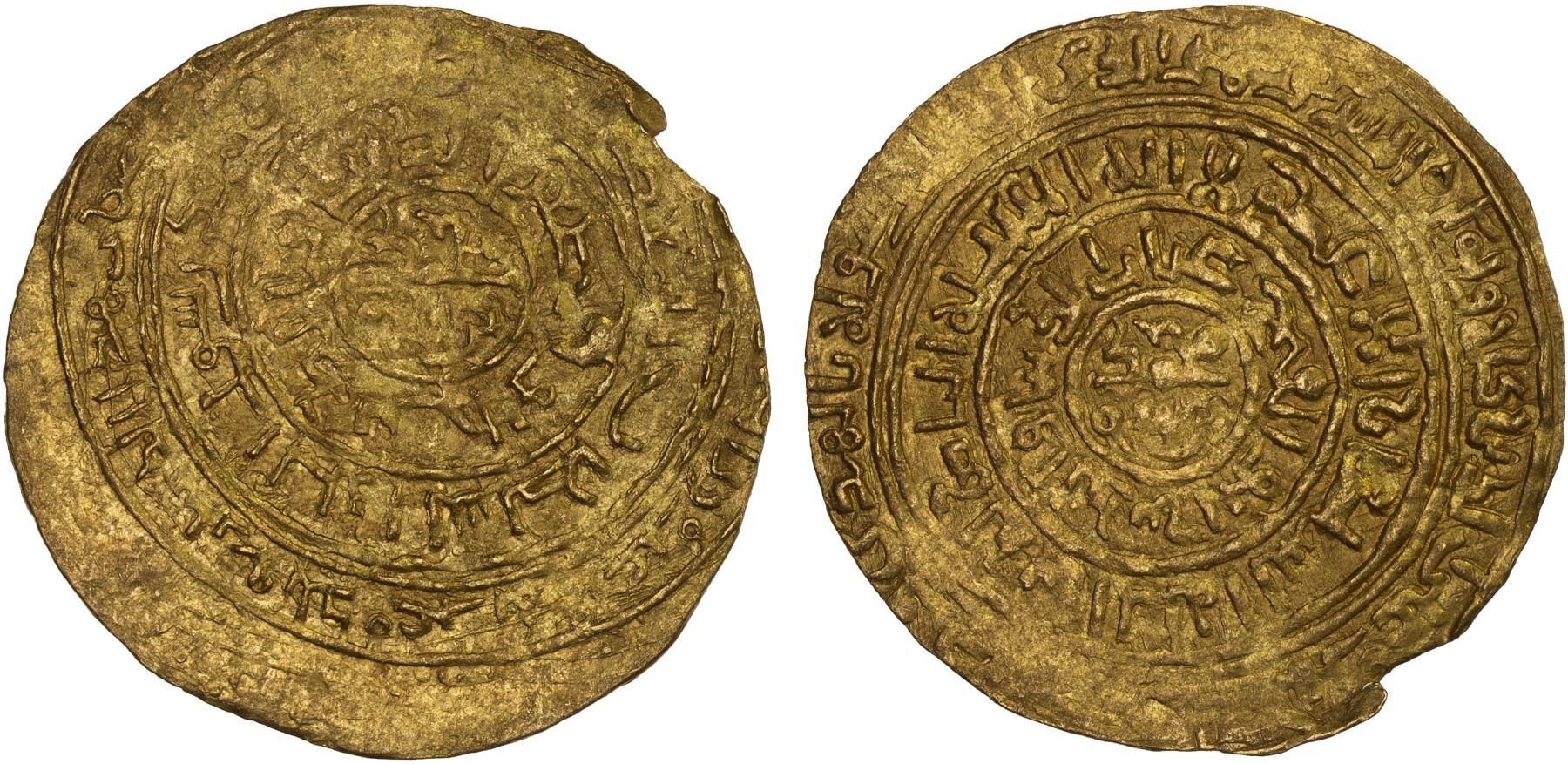 GHORID: Mu'izz al-Din Muhammad, 1171-1206, AV dinar (3.05g), Ghazna, DM, A-1760, Goron-D1, cf. Zeno-197654, "bull's eye" type with three outer circular legends and muhammad / bin sam in the center on both sides (for Mu'izz al-Din and his brother Ghiyath al-Din), with the Qur'an verse 9:33 in the outer margin; partially double-struck, XF-AU.