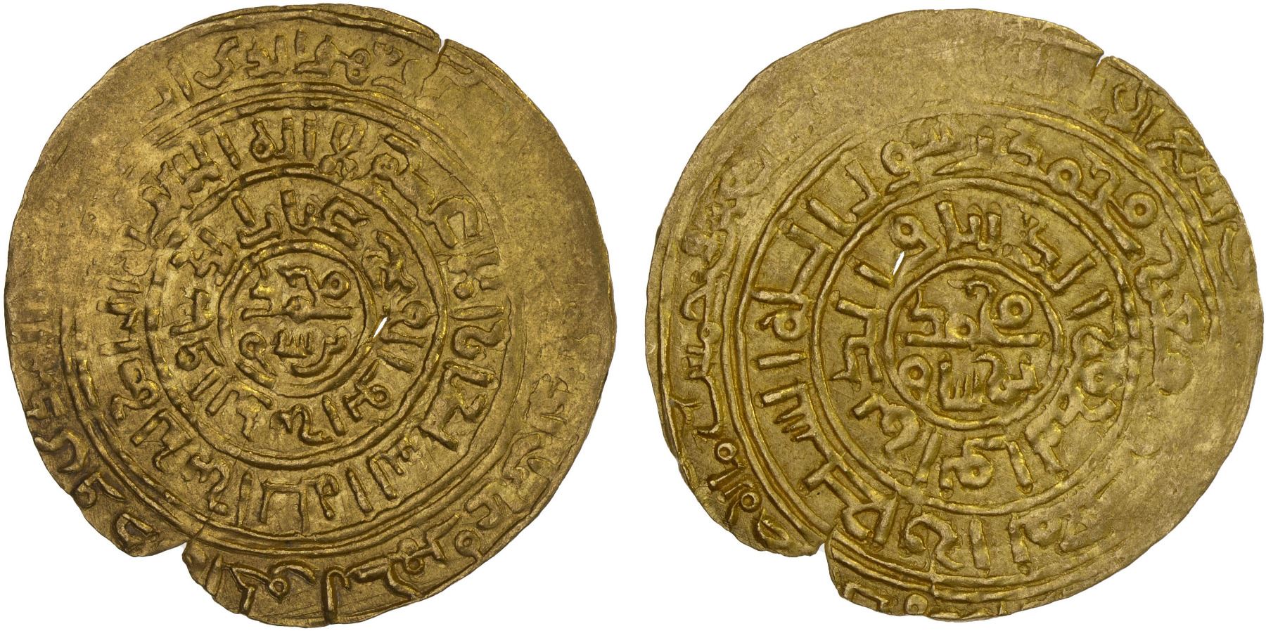 GHORID: Mu'izz al-Din Muhammad, 1171-1206, AV dinar (3.46g) (Ghazna), AH59x (596 or 597), A-1760, Goron-D1, cf. Zeno-197654, "bull's eye" type with three outer circular legends and muhammad / bin sam in the center on both sides (for Mu'izz al-Din and his brother Ghiyath al-Din), with the Qur'an verse 9:33 in the outer margin; minimal weakness and about 8% flat strike, AU, R.