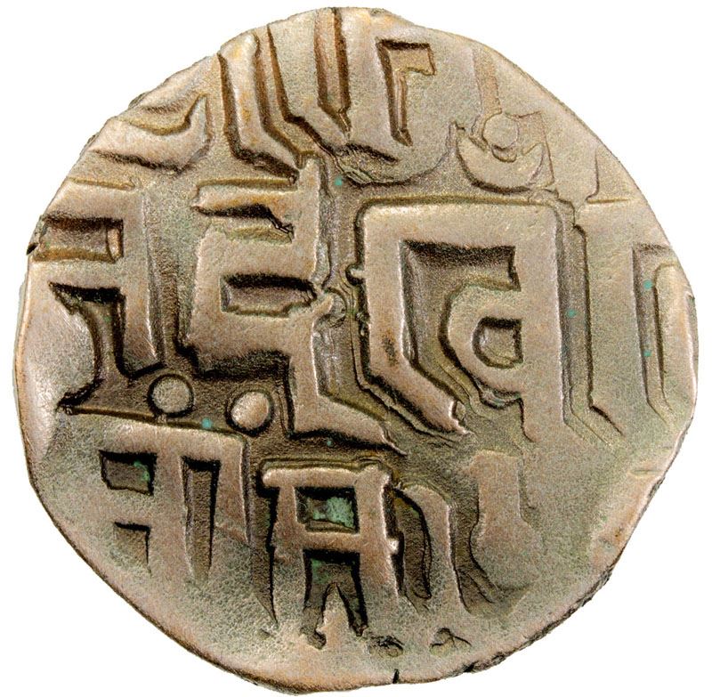 GHORID: Mu'izz al-Din Muhammad, 1171-1206, debased AV dinar (4.48g), NM, ND, A-1764.1, Deyell-252, stylized Lakshmi seated // Nagari legend, Kanauj mint style, VF, ex Hans Mondorf Collection.