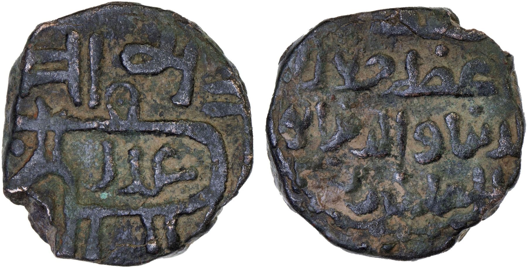 GHORID OF BAMIYAN: Jalal al-Din 'Ali, 1206-1215, AE jital (2.82g), NM, ND, A-1809D, Zeno-1887, bull left, Arabic 'adl on body // lengthy Arabic legend including jalal al-dunya wa'l-din abu'l-muzaffar bin sam, VF, RRR. This appears to be the second known example of this type, the other Zeno-1887.