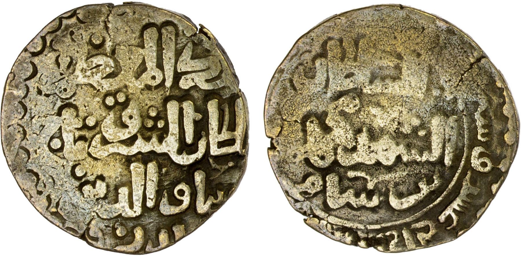 GHORID: Taj al -Din Yildiz, 1206-1215, debased AV dinar (4.05g) (Ghazna), AH612, A-1793, citing the deceased Muhammad b. Sam as al-sultan al-shahid ("the martyred sultan"), himself as "sultan of the east"; boldly legible date, F-VF, R, ex M.H. Mirza Collection.