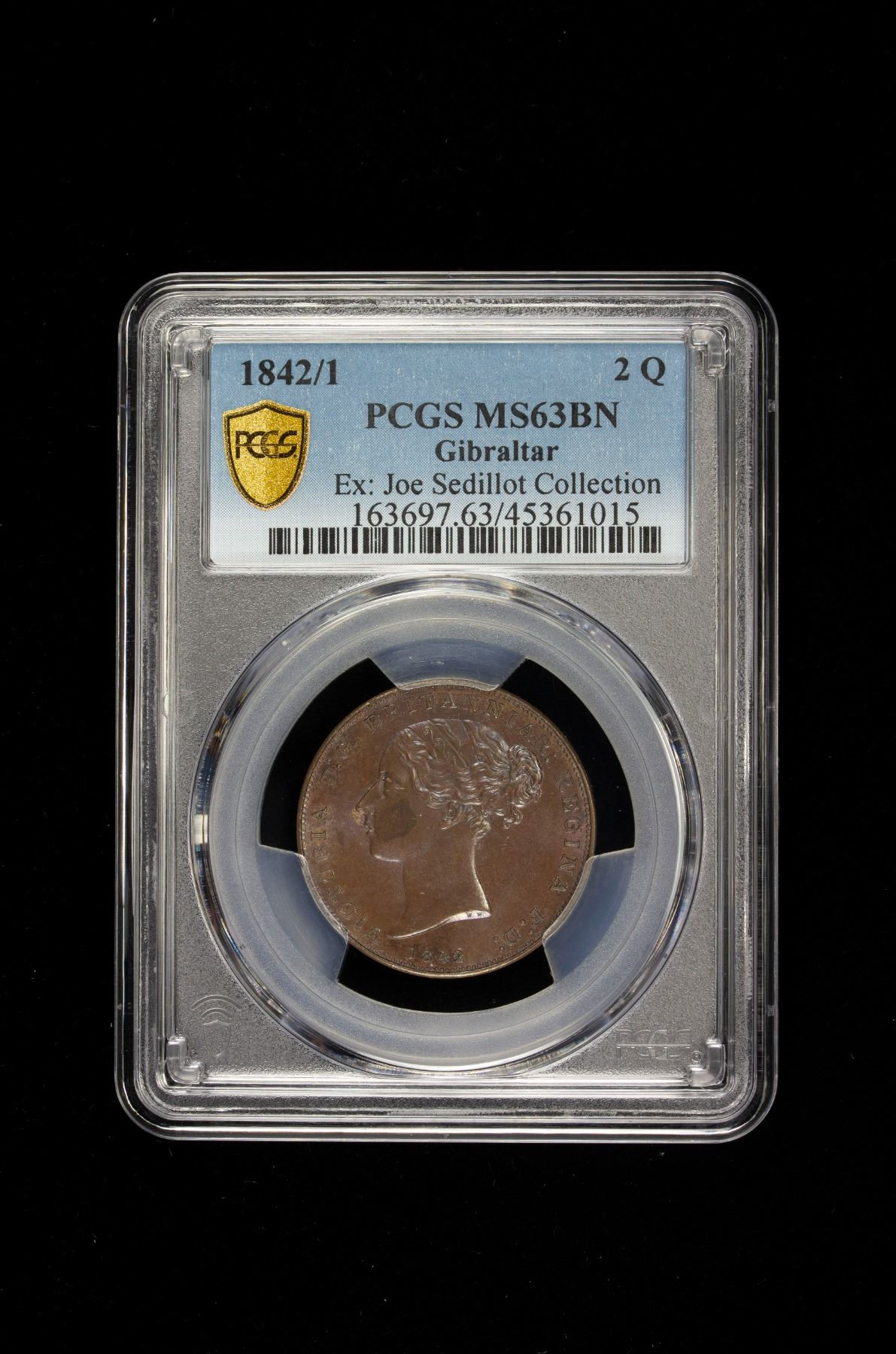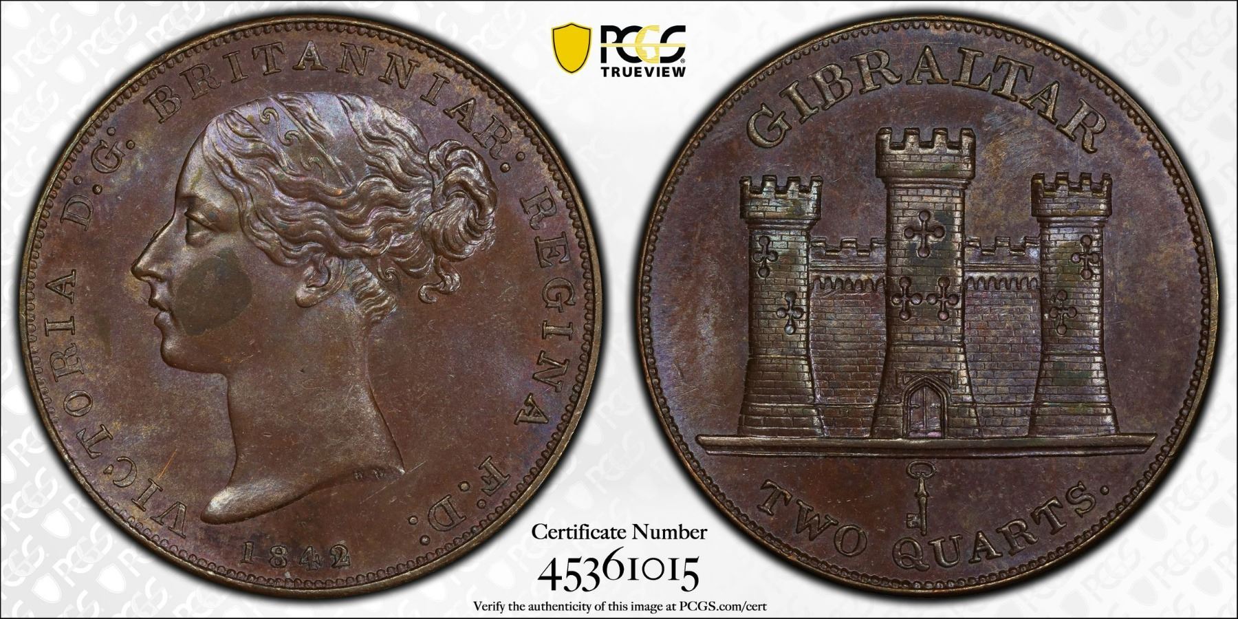 GIBRALTAR: Victoria, 1837-1901, AE 2 quarts, 1842/1, PCGS MS63 BN