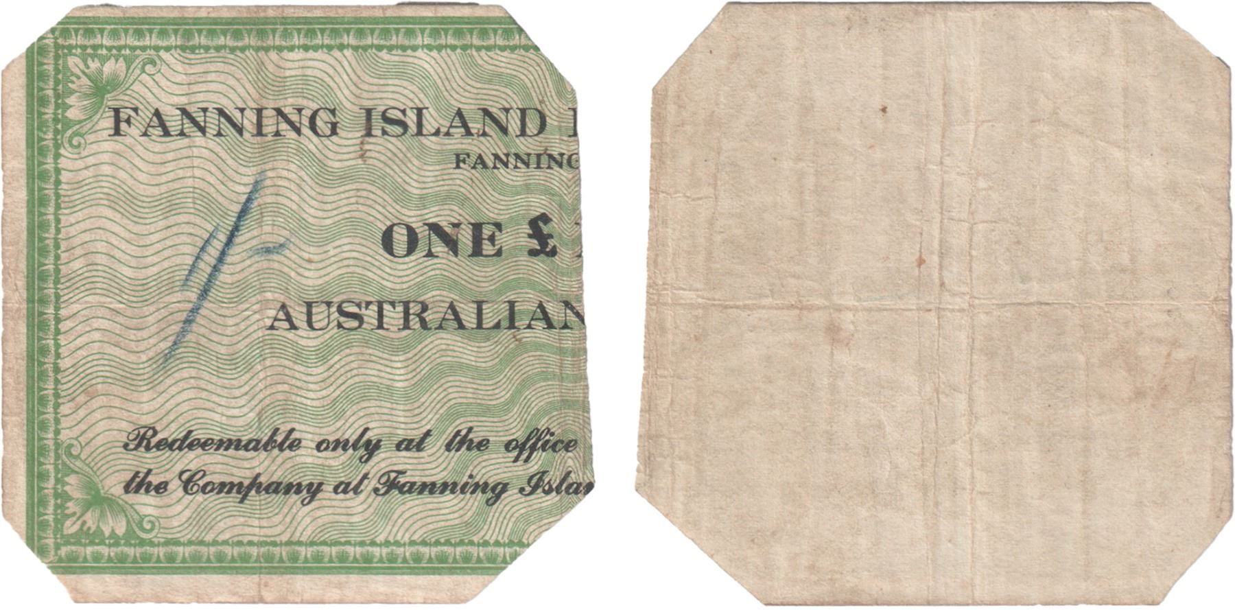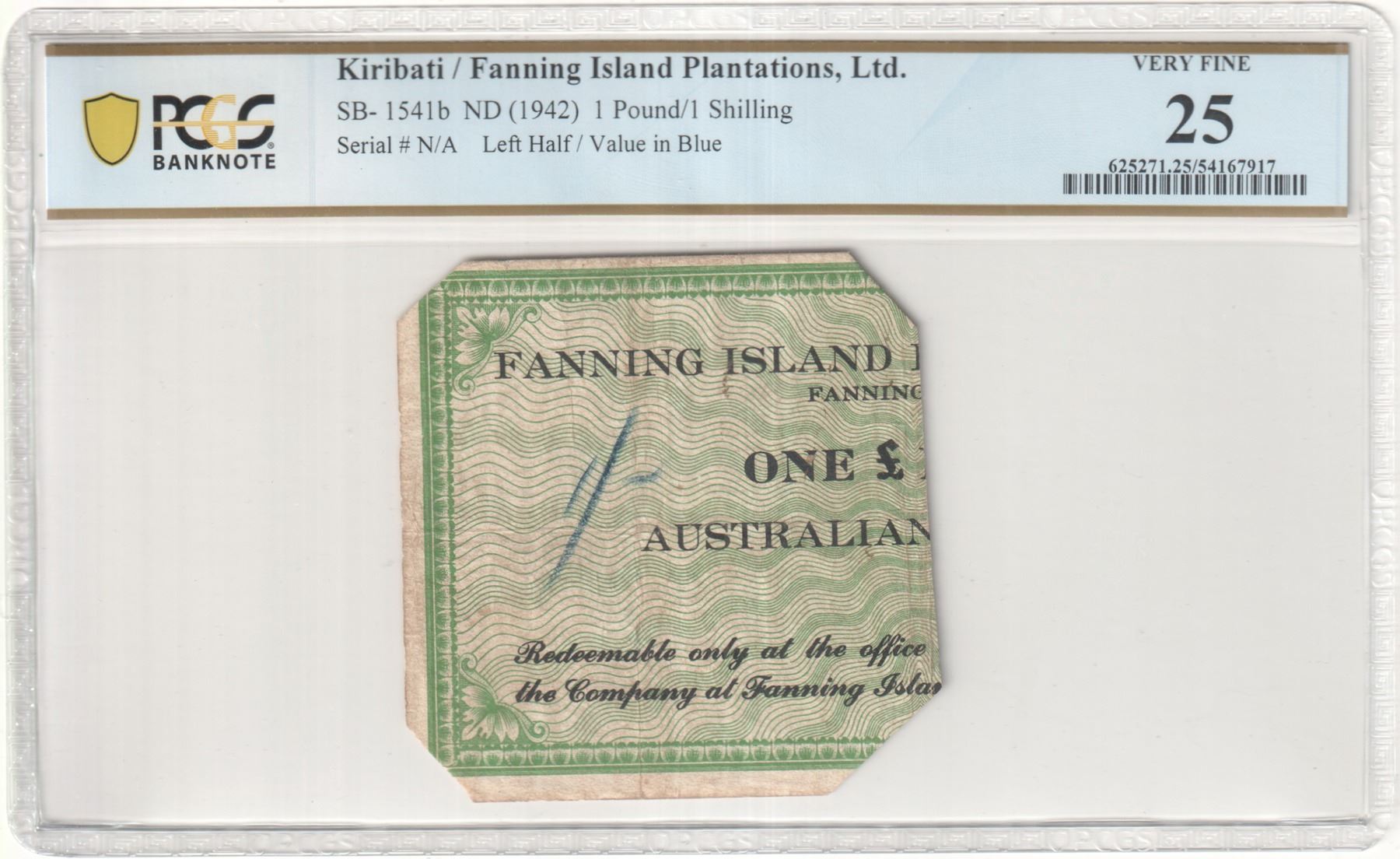 GILBERT & ELLICE ISLANDS: 1 shilling, Fanning Island, ND (1942), SB1-541b, Fanning Island Plantations Ltd, left half of one pound note, value in blue, PCGS graded VF25. Fanning Island is today known as "Tabuaeran" and is part of Kiribati. In 1942 an American army task force moved onto the island and the soldiers rapidly absorbed the available supply of Australian currency in circulation. A quantity of approximately 3,000 bank notes were ordered (printed in Honolulu) by coconut plantation manager R. G. Garrett, to alleviate the shortage of cash. The notes were later cut in half and used as theater and cinema tickets with the left half of the cut note having a hand written value of 1 shilling (1/-) while the right half became a 2 shilling (2/-) value.