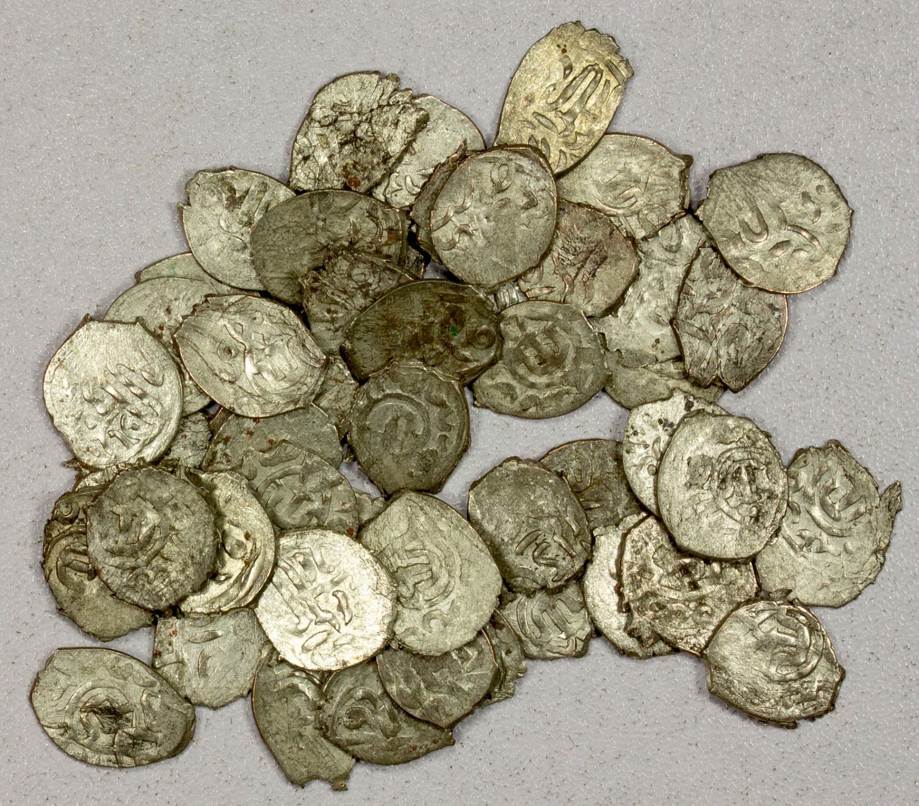 GIRAY KHANS (CRIMEA): Dawlat Giray I, 1550-1570, LOT of 50 silver akçes, generally as Retovski group 6 of this ruler, mint of Qiriq-Yer and date AH957; just a couple of the examples in this lot show the mint, date, or both; average strike with the usual weakness, Fine to VF condition; retail value $1000, lot of 50 pieces.